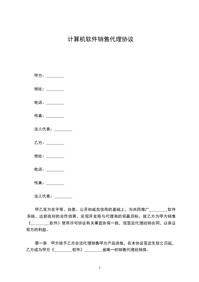 第一条 甲方给予乙方合法代理销售甲方产品资格,在本协议签定生效之日起,乙方成为甲方《_________软件》_________省唯一的销售代理经销商。