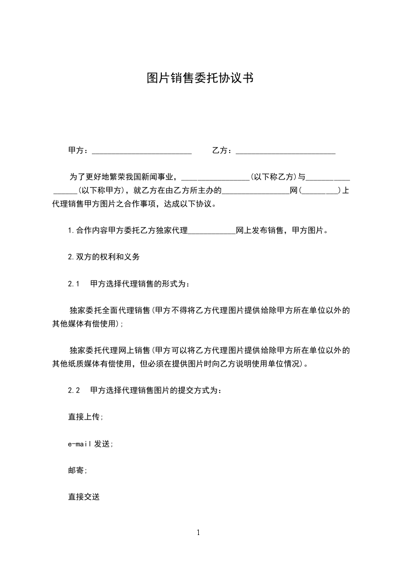 为了更好地繁荣我国新闻事业,_________________(以下称乙方)与_________________(以下称甲方),就乙方在由乙方所主办的_________________网(_________)上代理销售甲方图片之合作事项,达成以下协议。
