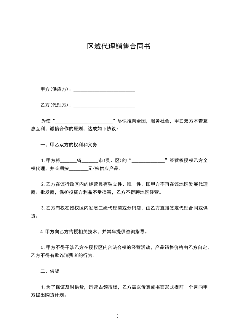 1.区域代理条件为:地区以上级(含地区)须承销____________万株以上,并在签定合同日首次提货____________株以上,县市级须承销________万株以上,并在签定合同日首次提货________株以上。