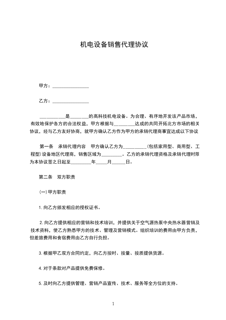 第一条 承销代理内容 甲方确认乙方为__________(包括家用型、商用型、工程型)设备地区代理商,销售区域为_________。乙方的承销代理资格及承销代理时限为本协议签之日起至_________年_____月______日。