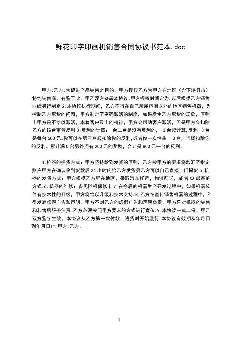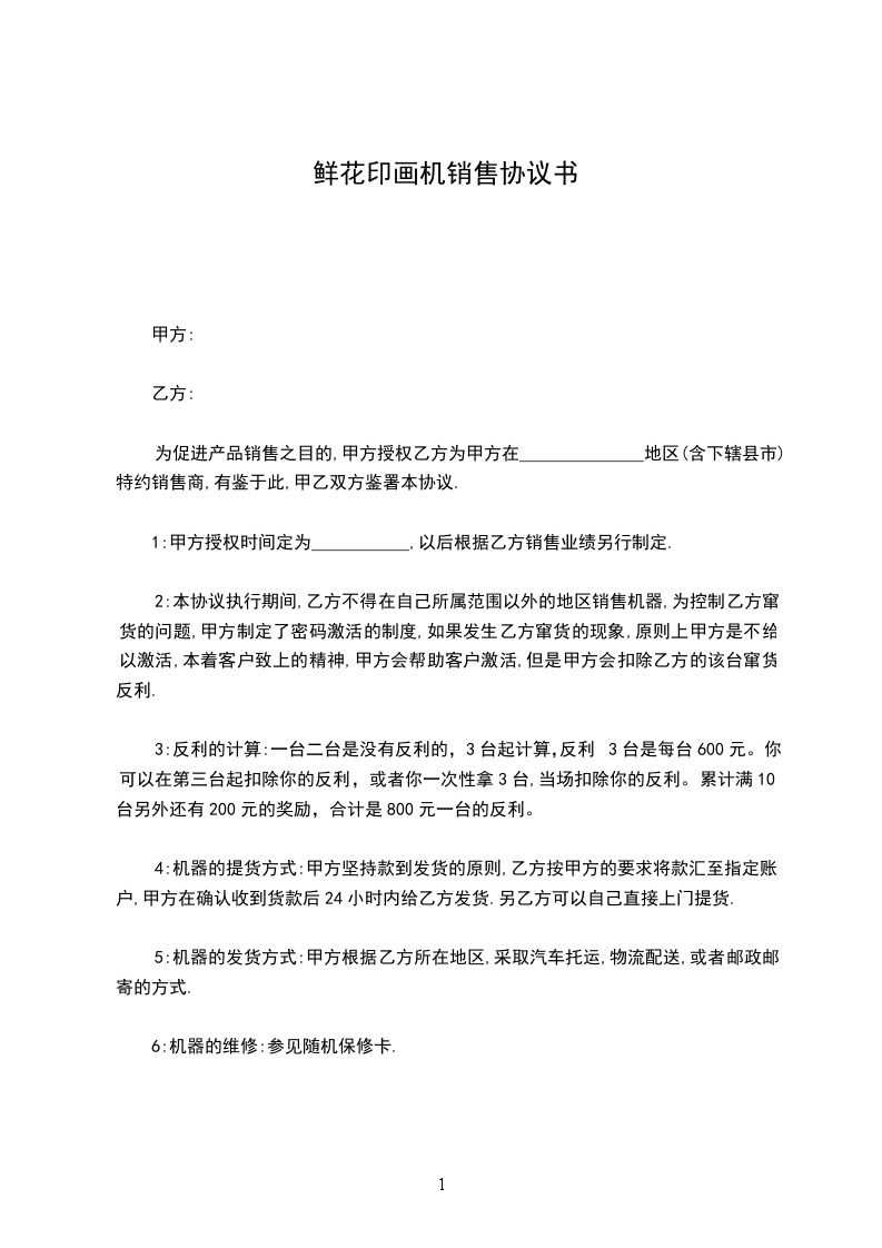 鲜花印画机销售协议书