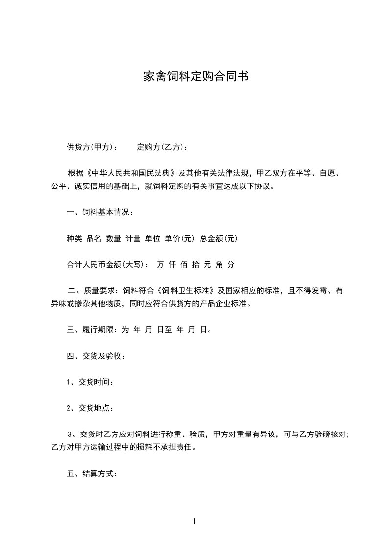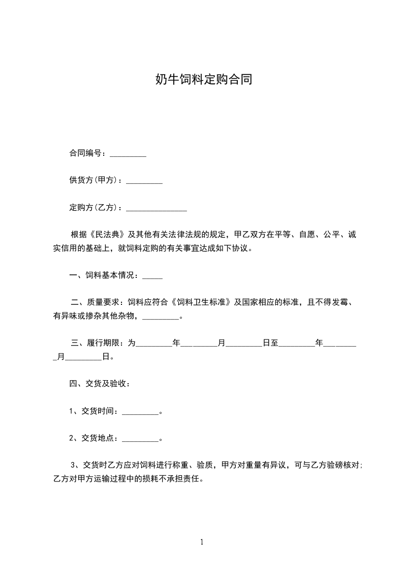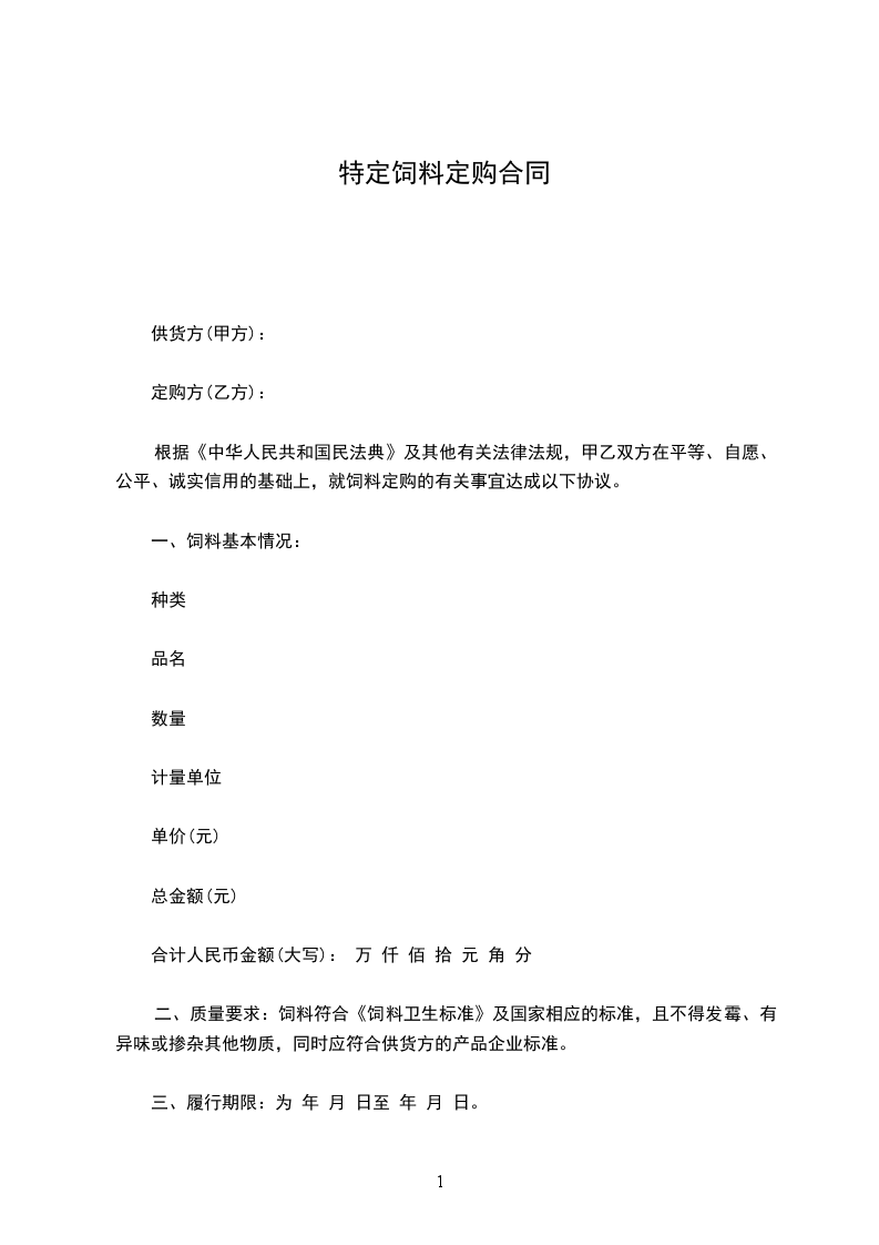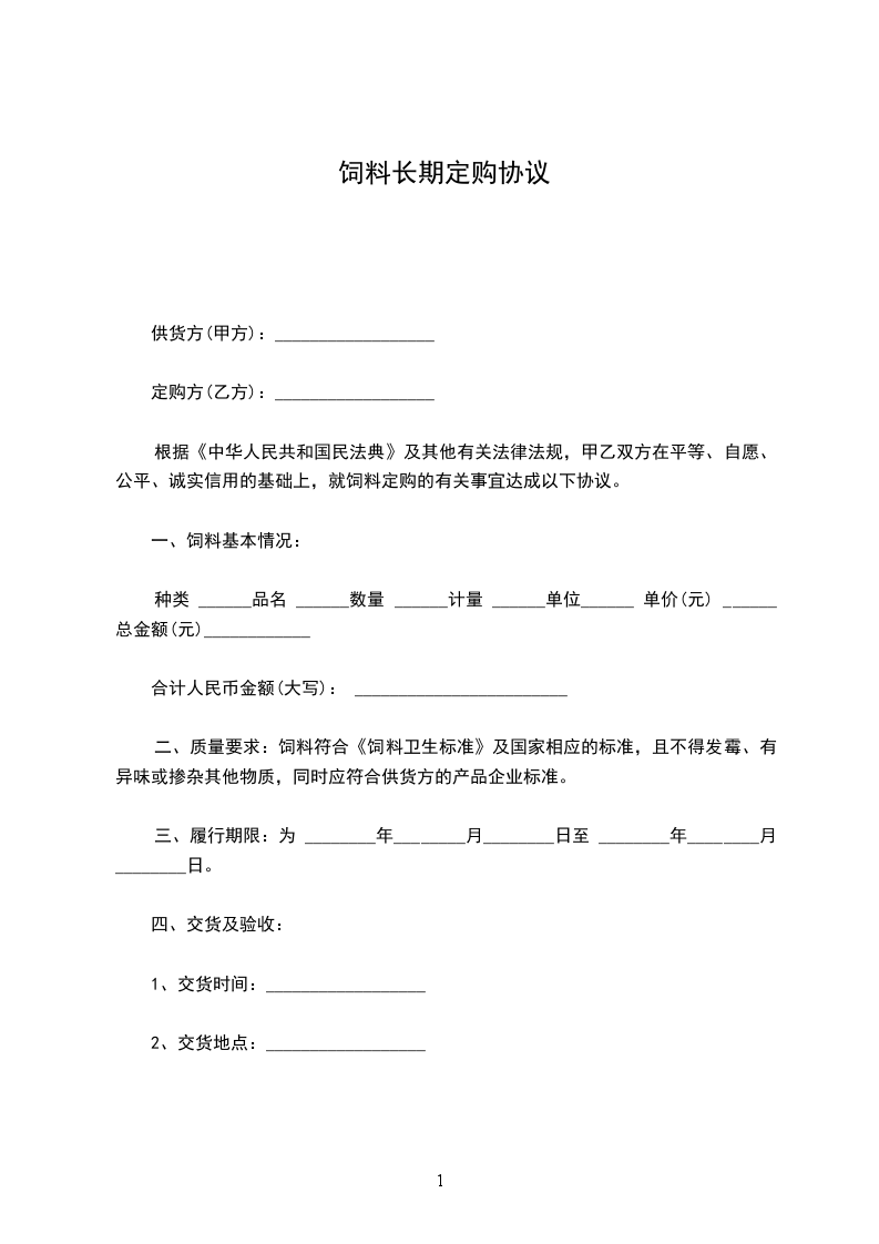 根据《中华人民共和国民法典》及其他有关法律法规,甲乙双方在平等、自愿、公平、诚实信用的基础上,就饲料定购的有关事宜达成以下协议。