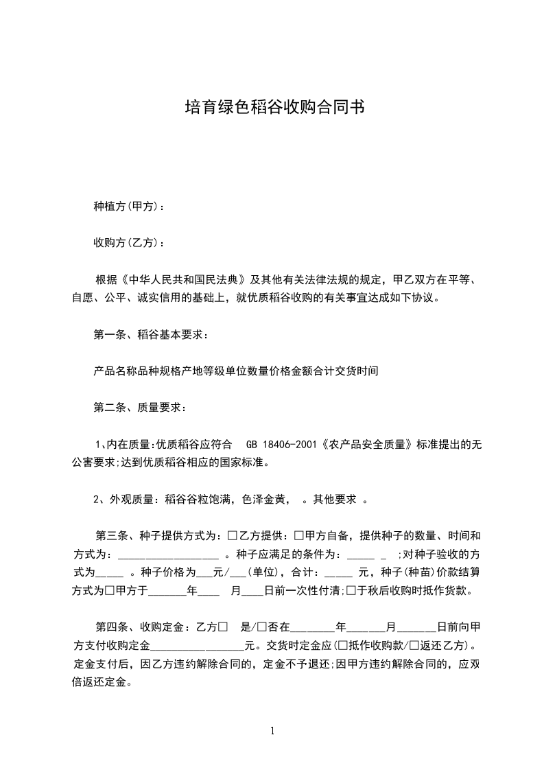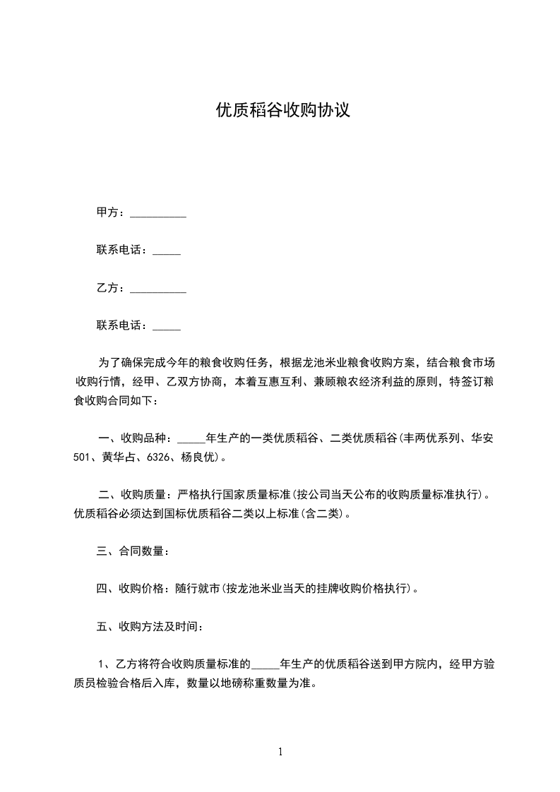 根据《中华人民共和国民法典》及其他有关法律法规的规定,甲乙双方在平等、自愿、公平、诚实信用的基础上,就优质稻谷收购的有关事宜达成如下协议。