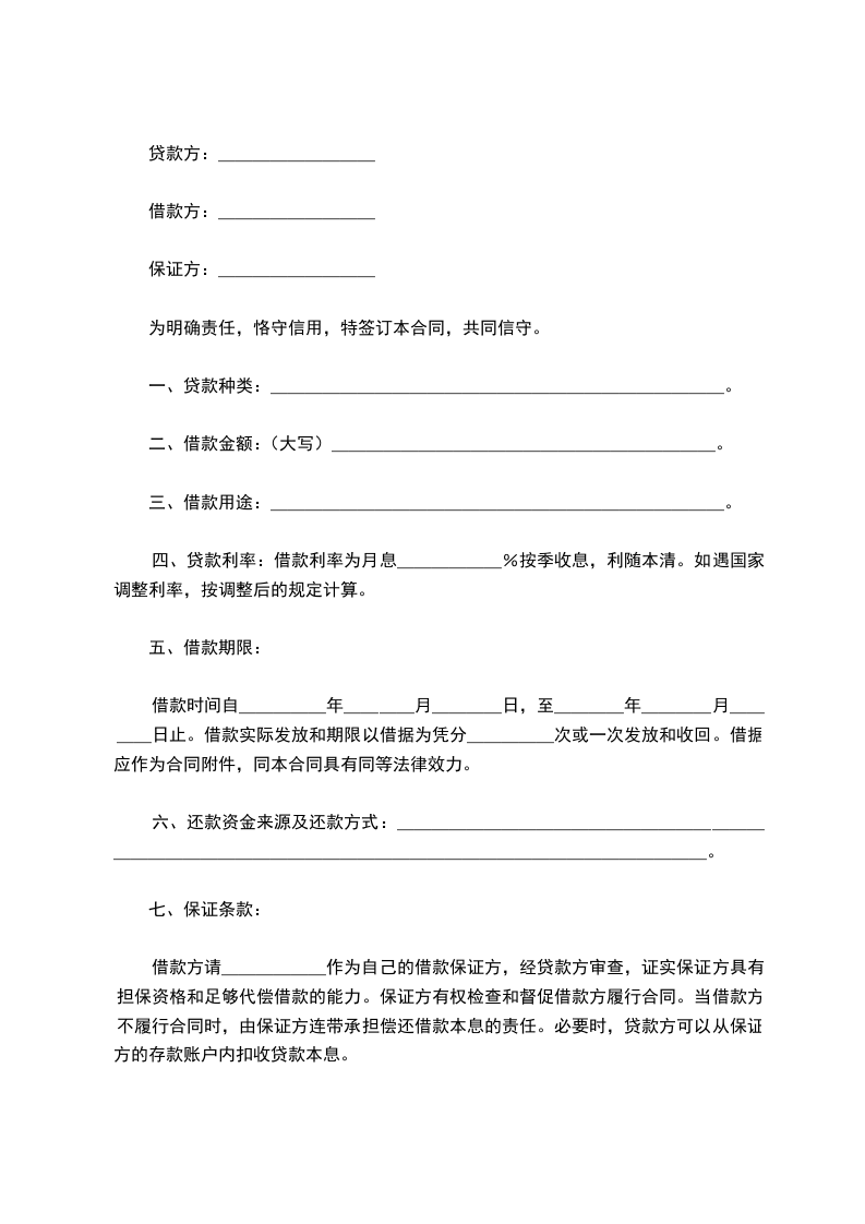 借款方请______作为自己的借款保证方,经贷款方审查,证实保证方具有担保资格和足够代偿借款的能力。保证方有权检查和督促借款方履行合同。当借款方不履行合同时,由保证方连带承担偿还借款本息的责任。必要时,贷款方可以从保证方的存款账户内扣收贷款本息。