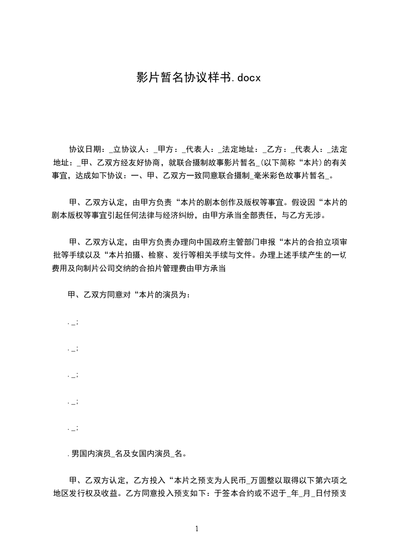 一、甲、乙双方一致同意联合摄制_______毫米彩色故事片暂名《_______ 》。