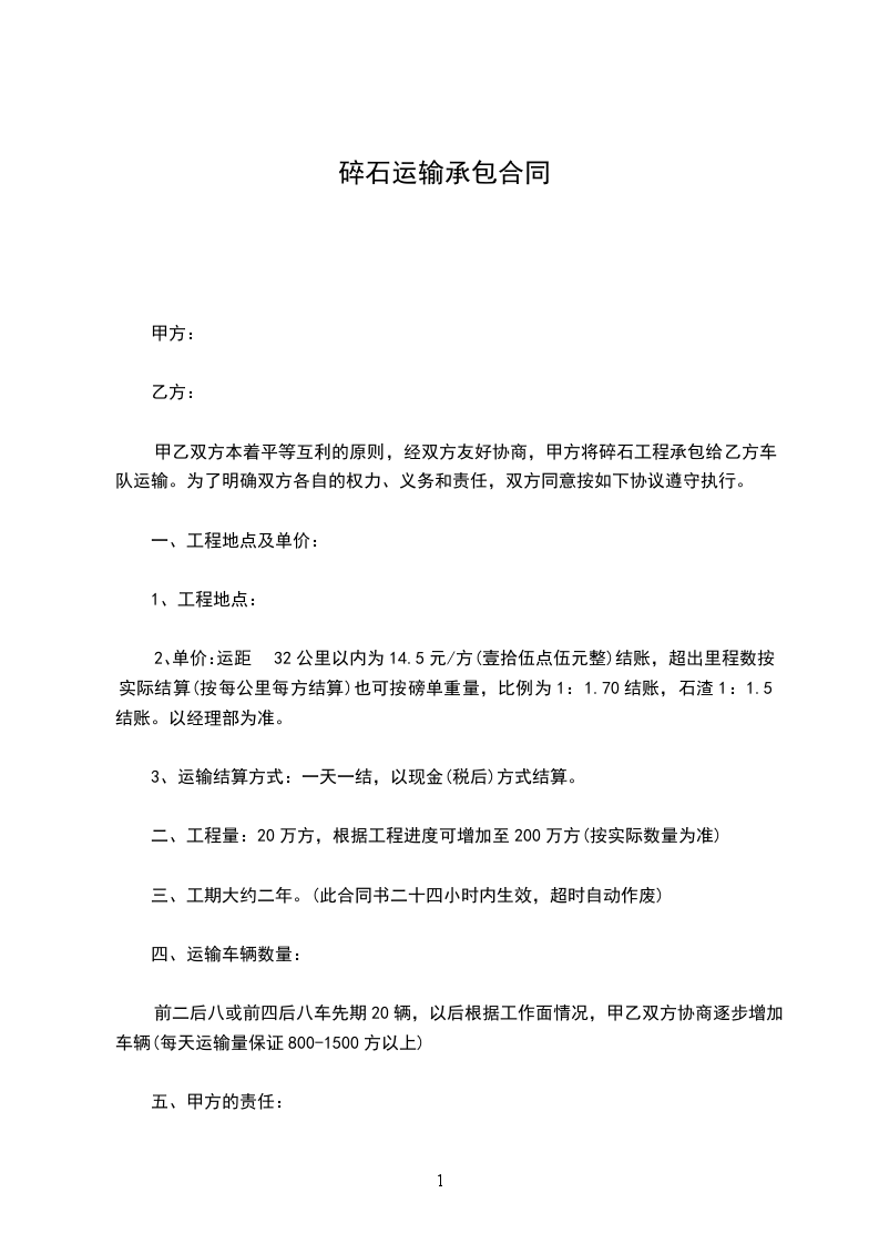 甲乙双方本着平等互利的原则,经双方友好协商,甲方将碎石工程承包给乙方车队运输。为了明确双方各自的权力、义务和责任,双方同意按如下协议遵守执行。