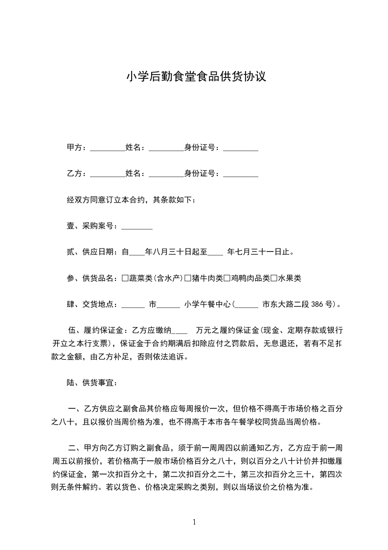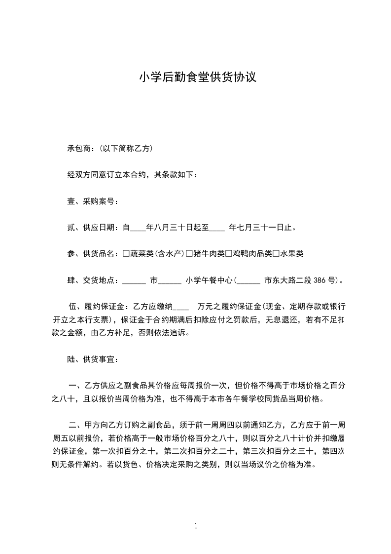 二、甲方向乙方订购之副食品,须于前一周周四以前通知乙方,乙方应于前一周周五以前报价,若价格高于一般市场价格百分之八十,则以百分之八十计价并扣缴履约保证金,第一次扣百分之十,第二次扣百分之二十,第三次扣百分之三十,第四次则无条件解约。若以货色、价格决定采购之类别,则以当场议价之价格为准。