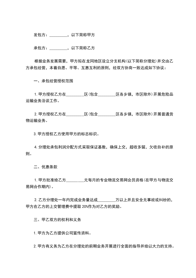 根据业务发展需要,甲方拟在龙冈地区设立分支机构(以下简称分理处)并交由乙方承包经营,本着自愿、平等、互惠互利的原则,经双方协商一致达成如下协议: