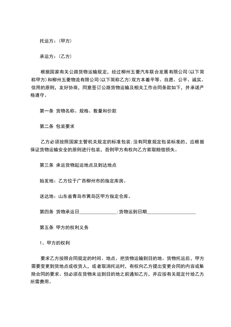 根据国家有关公路货物运输规定,经过柳州五菱汽车联合发展有限公司(以下简称甲方)和柳州五菱物流有限公司(以下简称乙方)双方本着平等、自愿、公平、诚实、信用的原则,友好协商,同意签订公路货物运输及相关工作合同条款如下,并承诺严格遵守。