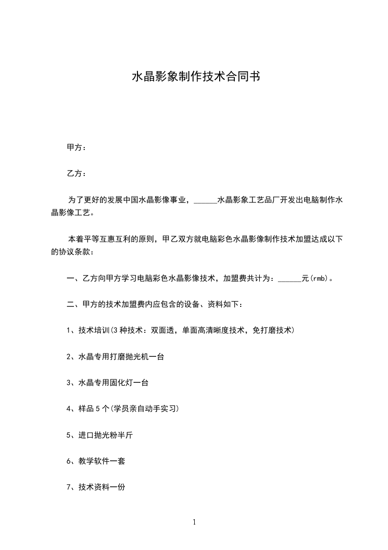 三、甲方在制作技术上不得保留,确保乙方能做出甲方样品室内的图片效果,包教包会,学期为_____天,如没学会可以免费再学。如不懂电脑者,学期可延长。乙方可享受甲方水晶技术免费升级服务。
