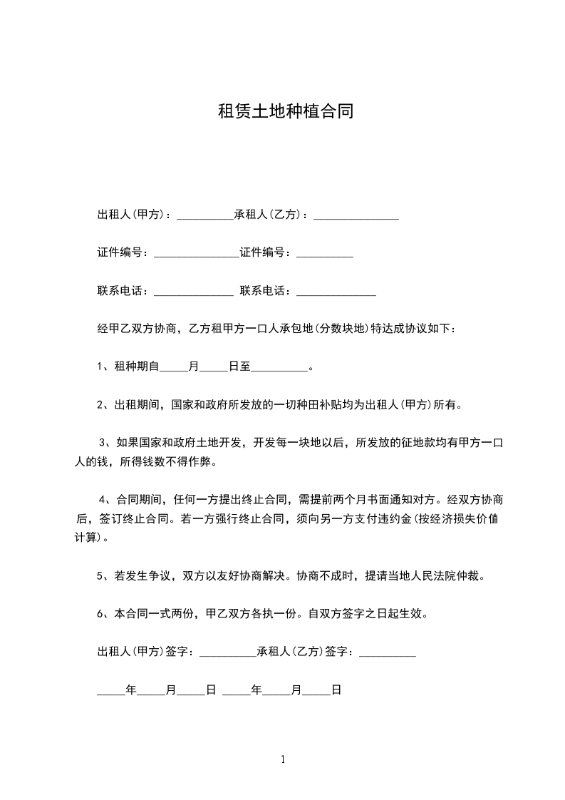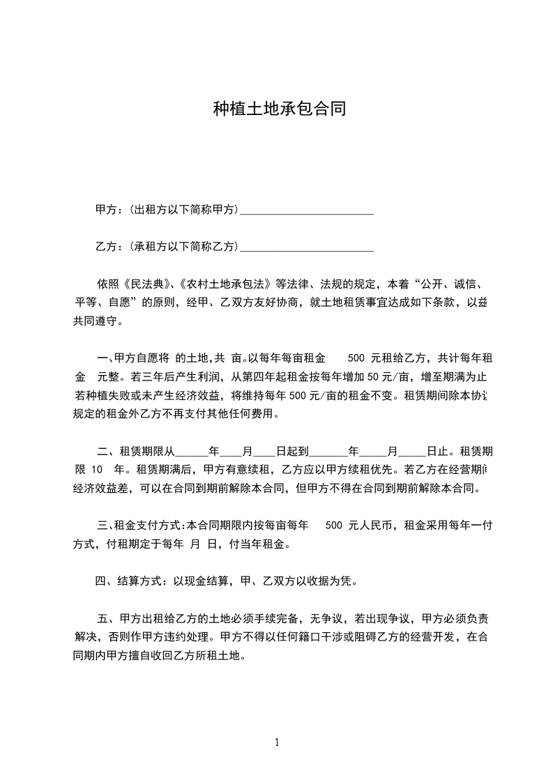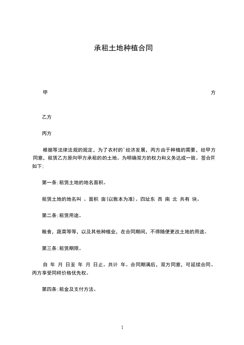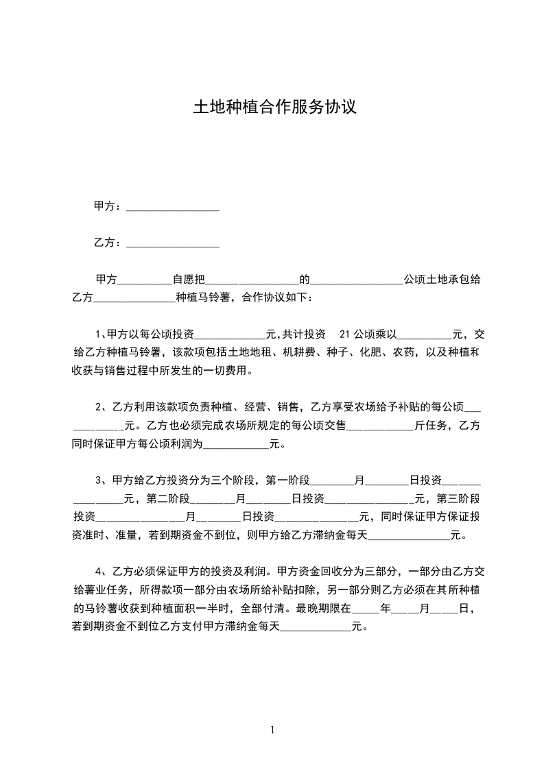 甲方__________自愿把_________________的_________________公顷土地承包给乙方_______________种植马铃薯,合作协议如下: