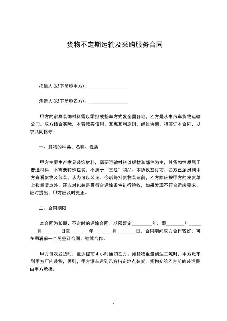 本合同为长期、不定时的运输合同。期限暂定_________年,即________年________月________日至________年________月________日,合同期间双方合作较好,可在期满前一个另签订合同,继续合作。
