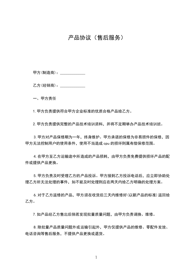 7.如产品经乙方售出后倘若发现批量质量问题,由甲方负责调换、维修。