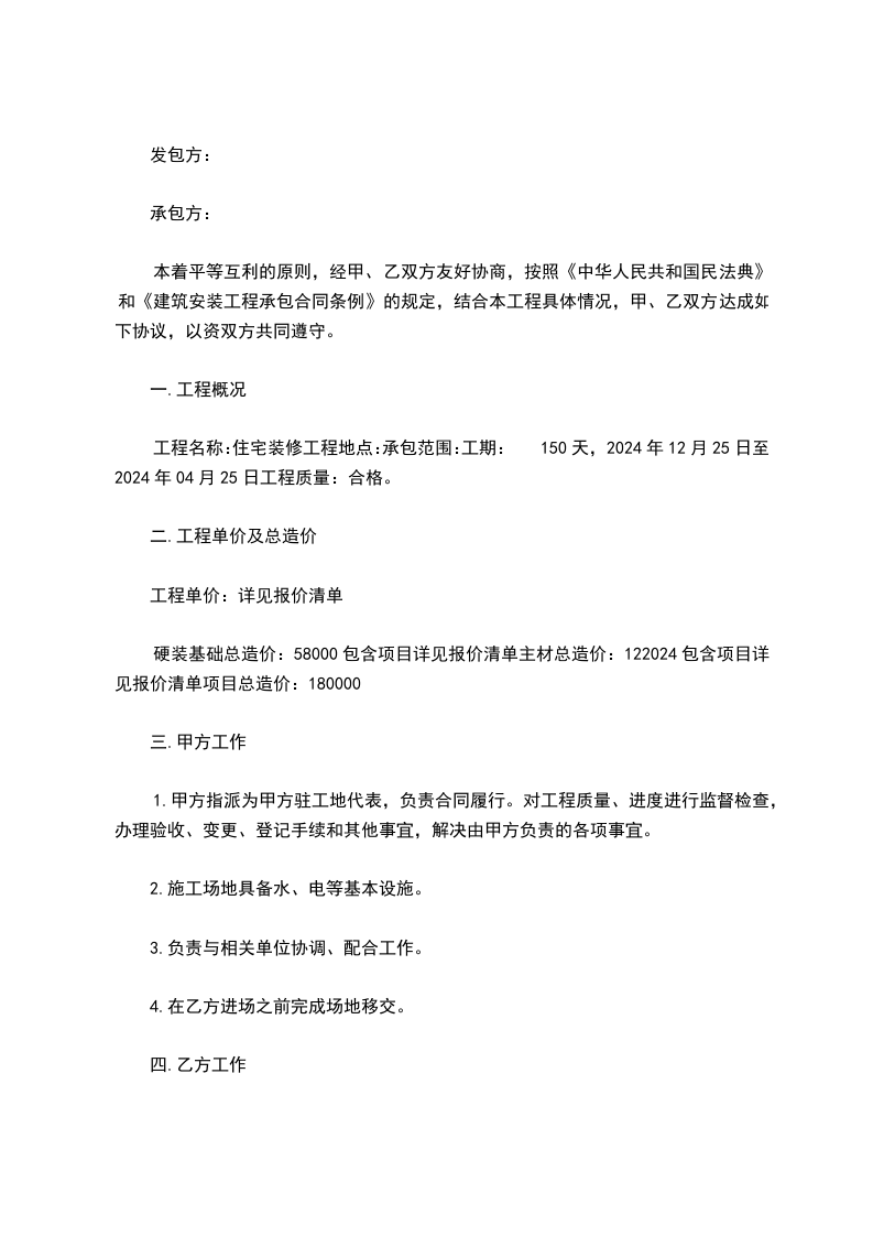 工程名称:住宅装修工程地点:承包范围:工期:150天,2024年12月25日至2024年04月25日工程质量:合格。