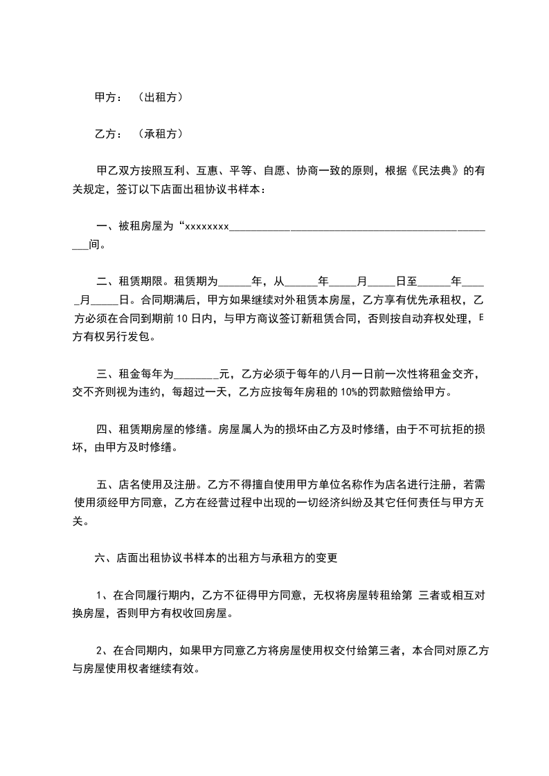 甲乙双方按照互利、互惠、平等、自愿、协商一致的原则,根据《民法典》的有关规定,签订以下店面出租协议书样本: