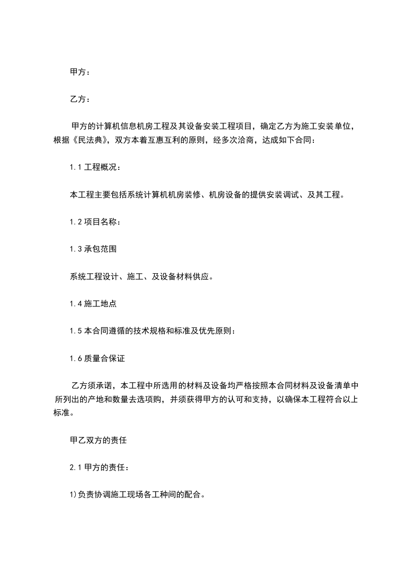 甲方的计算机信息机房工程及其设备安装工程项目,确定乙方为施工安装单位,根据《民法典》,双方本着互惠互利的原则,经多次洽商,达成如下合同: