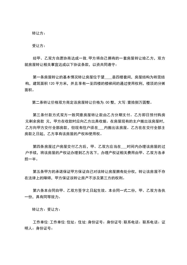 第一条房屋转让的基本情况转让房屋位于望____县四楼套间,房屋结构为砖混结构,建筑面积120平方米,并且享有一至四楼的楼梯间的通过使用权利,楼顶的分摊面积。