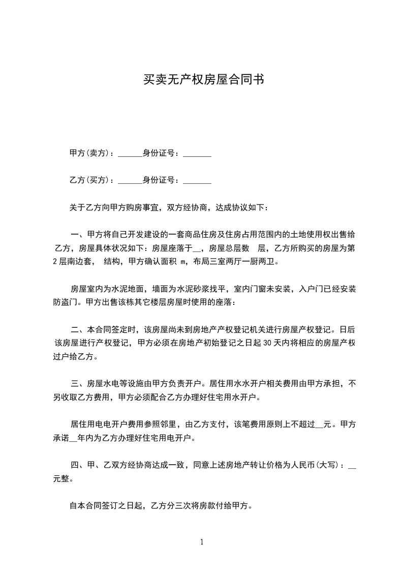 二、甲、乙双方达成一致后,并在本协议签章时,乙方应支付给甲方定金人民币____________元整。乙方得到该房屋一切手续后天内一次性付清甲方余款。