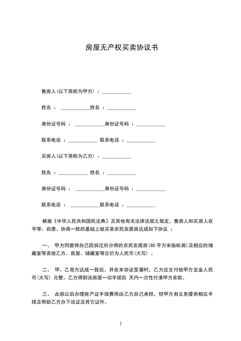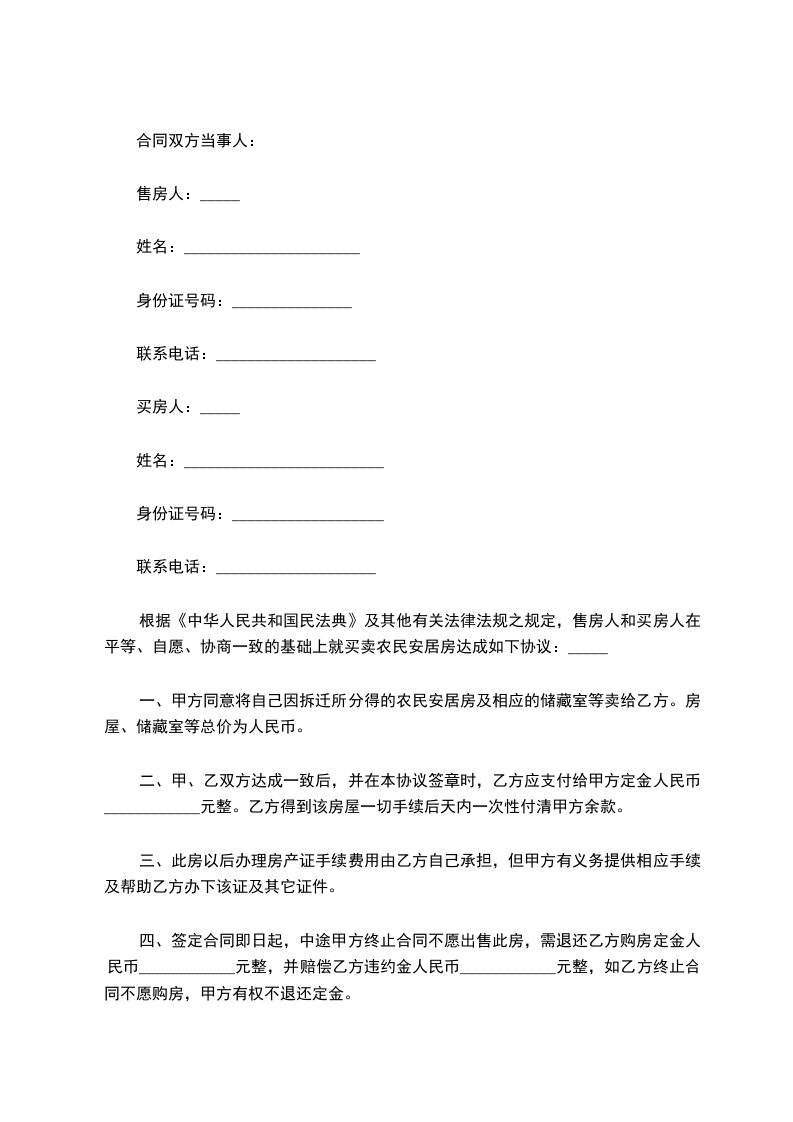 根据《中华人民共和国民法典》及其他有关法律法规之规定,售房人和买房人在平等、自愿、协商一致的基础上就买卖农民安居房达成如下协议:_____