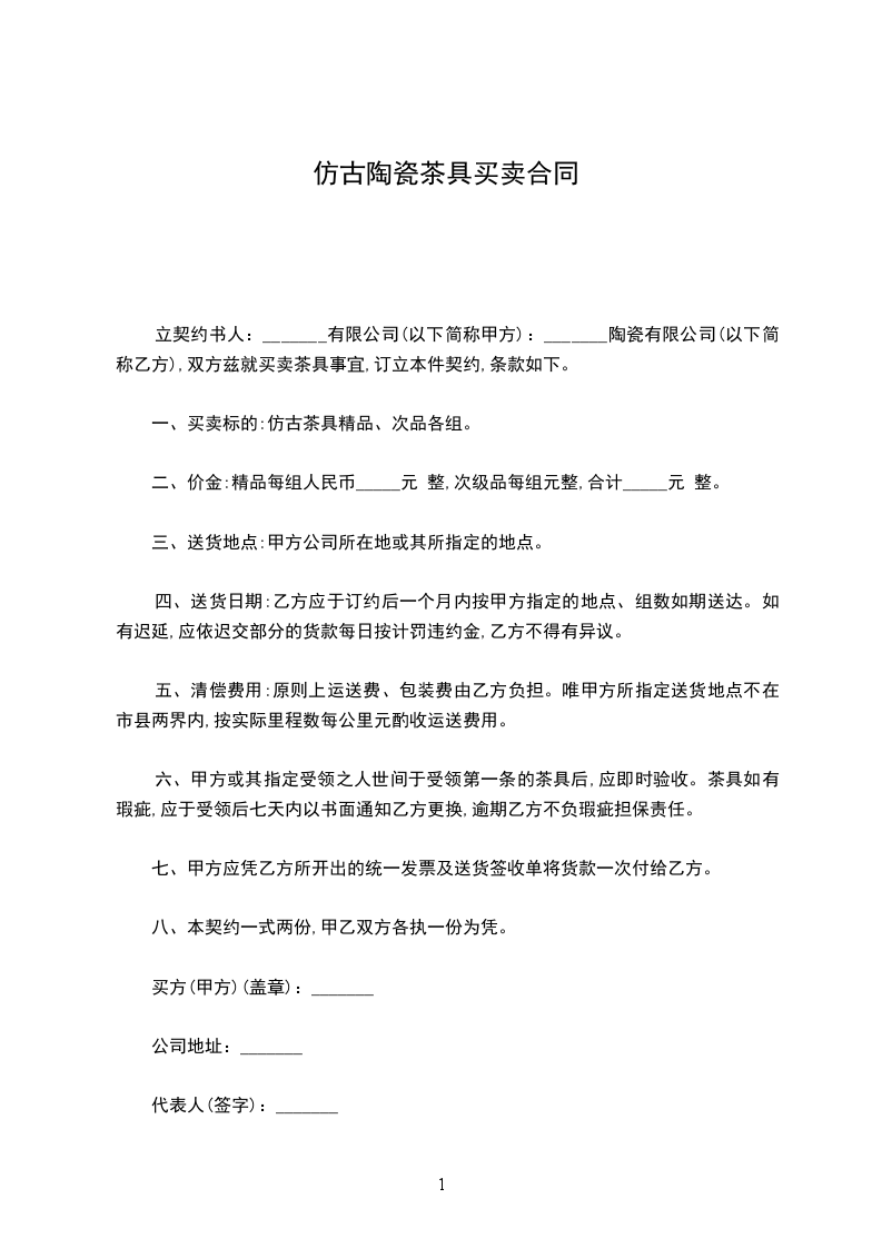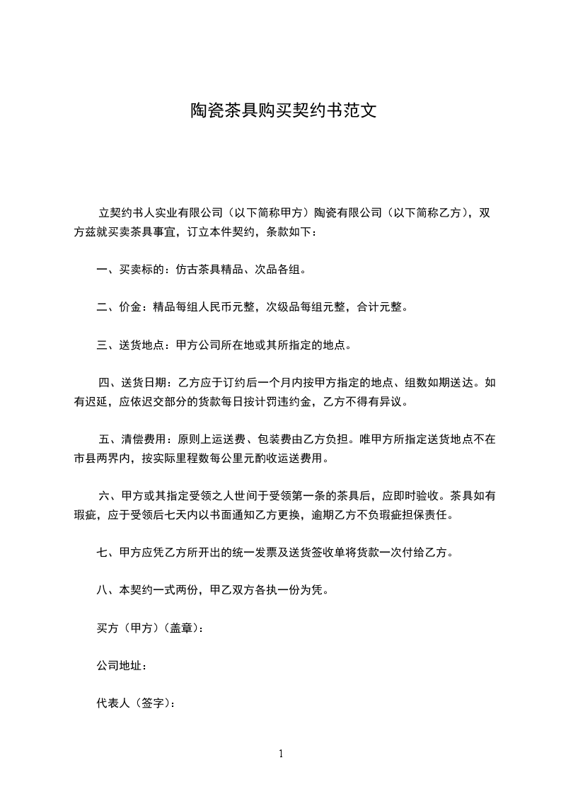 立契约书人实业有限公司(以下简称甲方)陶瓷有限公司(以下简称乙方),双方兹就买卖茶具事宜,订立本件契约,条款如下: