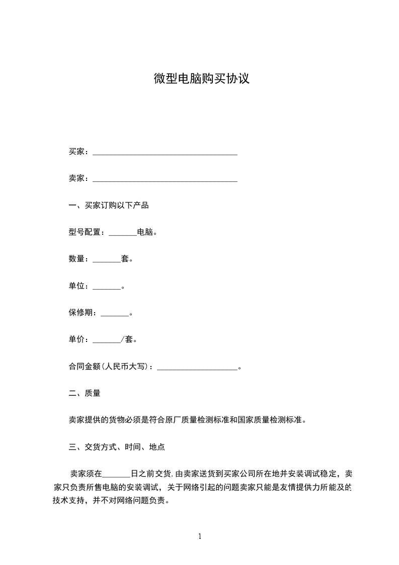1、甲方向乙方定购的电脑,共计__台配置详见附牛:电脑设备配置单,单价为:__元(大写:__)