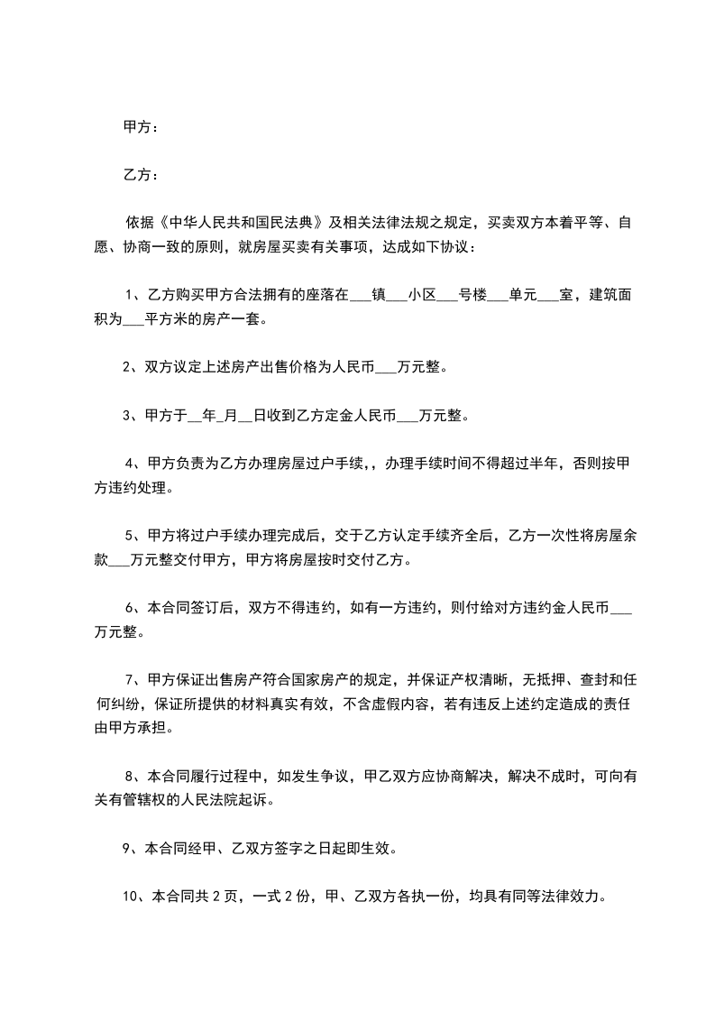 根据《中华人民共和国民法典》及其他有关法律、法规的规定,甲、乙双方在平等、自愿、协商一致的基础上,就乙方向甲方购买房屋签订本合同,以资共同信守执行。