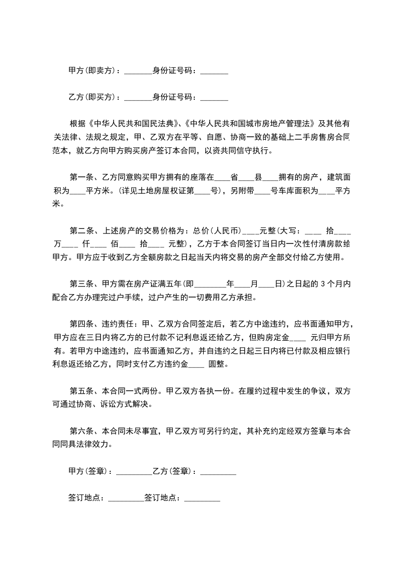 第二条双方约定上述房屋转让总价款为:人民币____________元整。第三条付款时间与方式:乙方已于______年______月______日转账支付定金人民币____________元整,剩余房款人民币____________元整,由乙方于签订本合同后,当日转账支付给甲方。