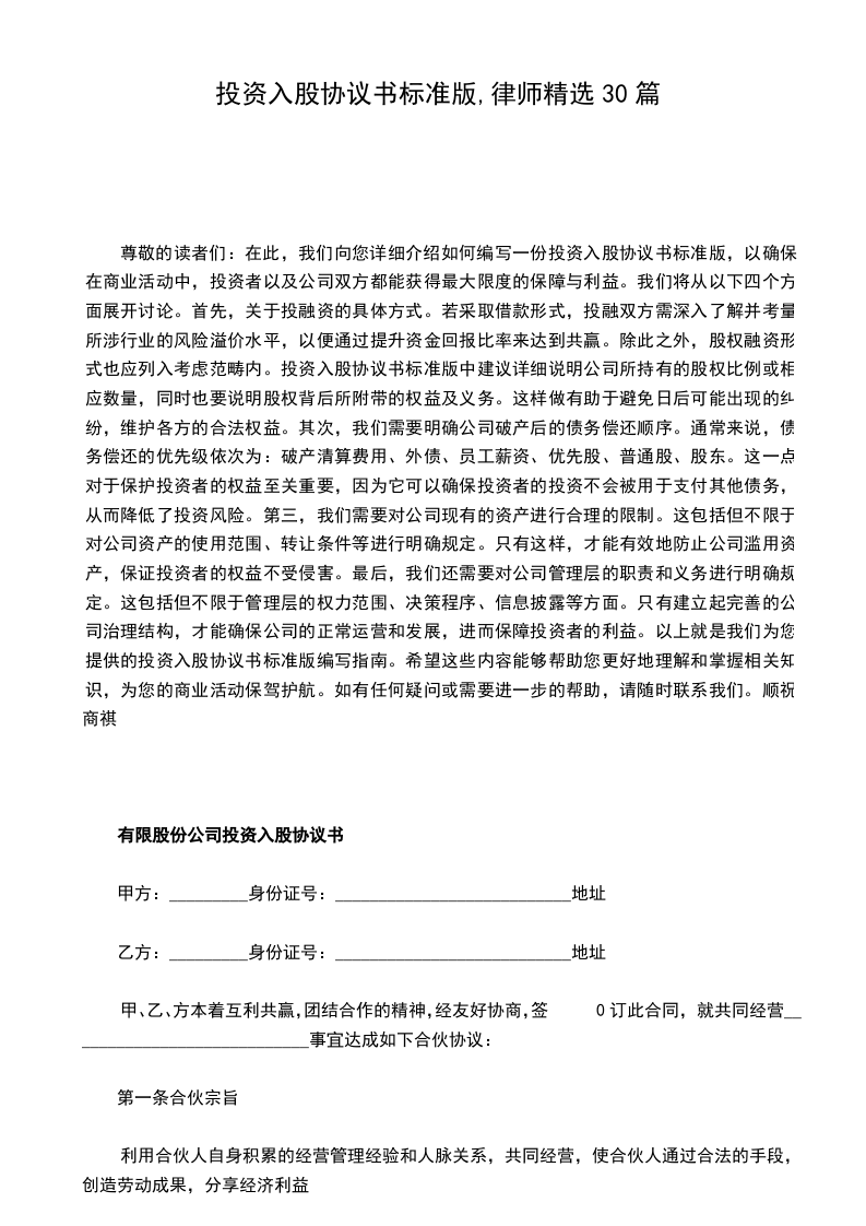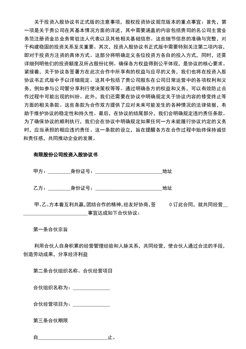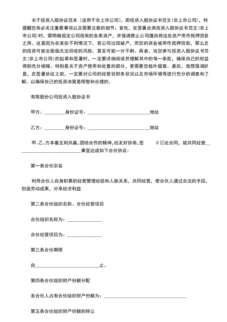 投资入股协议书范本(非上市公司)是一份详细阐述投资者与非上市公司之间投资入股事宜的法律文件,投资入股协议书范本(非上市公司)明确了投资者将以何种方式,多少资金入股以及入股后所持有的股份比例,股东权益管理权分配等重要事项,投资入股协议书范本(非上市公司)规定了公司的经营策略,盈利分配,股权转让,公司解散等相关条款,协议旨在保护投资者和公司的合法利益,确保双方在合作期间享有的明确的权利和义务。通过签订此协议有助于建立稳定公正的投资合作关系,推动公司的持续发展。