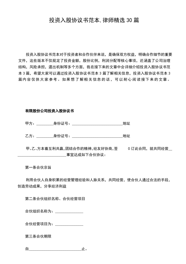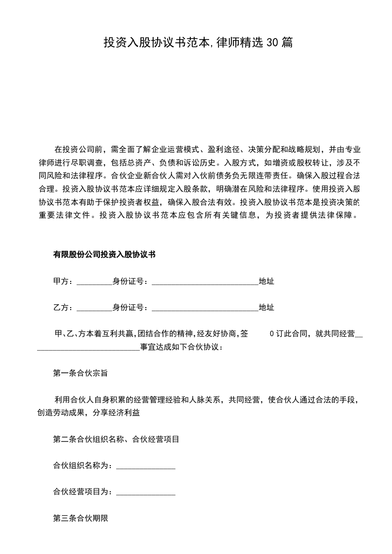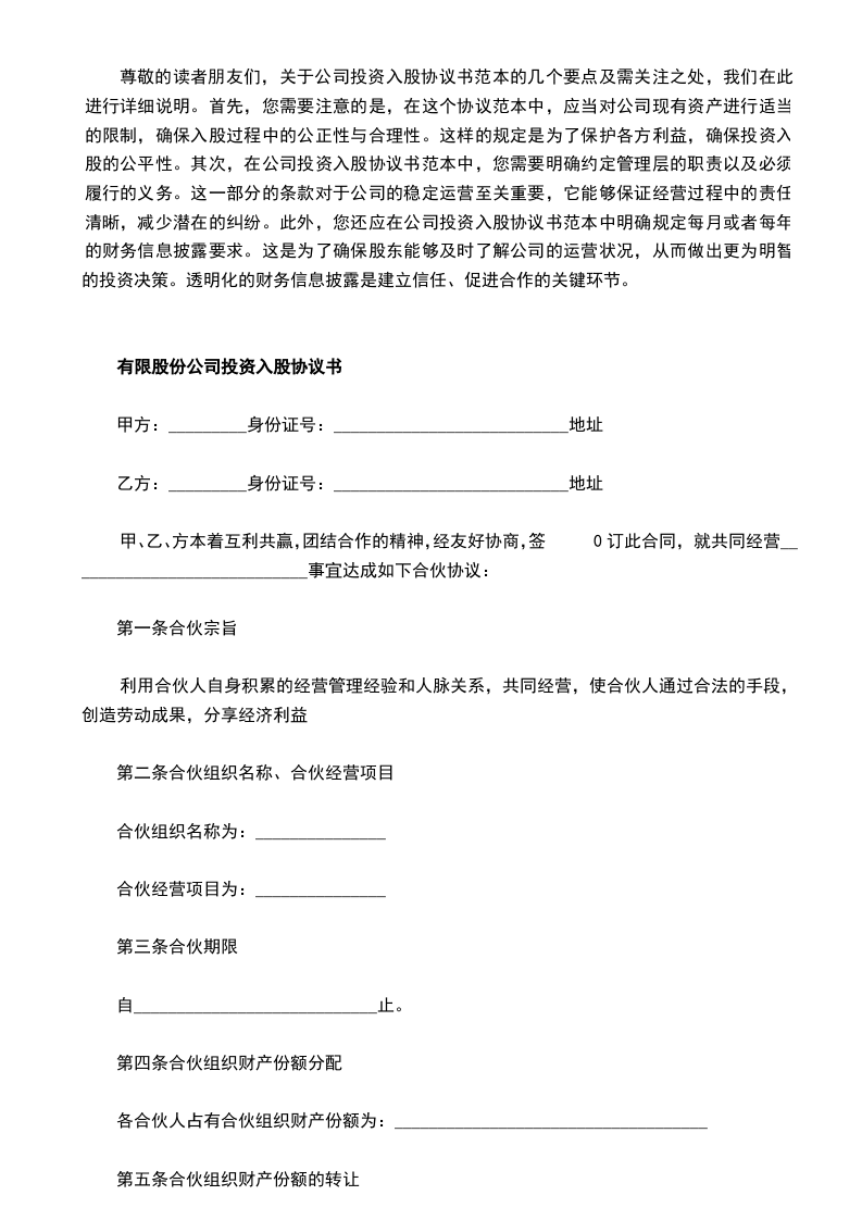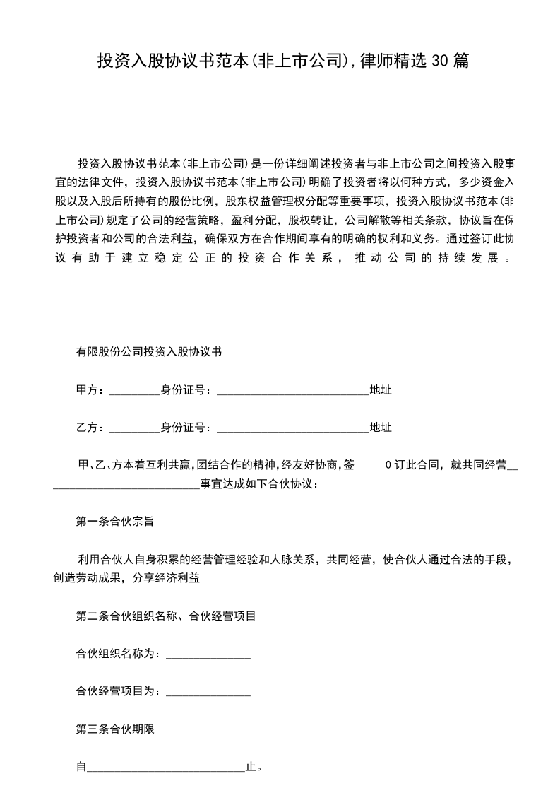 投资入股协议书范本(非上市公司)是一份详细阐述投资者与非上市公司之间投资入股事宜的法律文件,投资入股协议书范本(非上市公司)明确了投资者将以何种方式,多少资金入股以及入股后所持有的股份比例,股东权益管理权分配等重要事项,投资入股协议书范本(非上市公司)规定了公司的经营策略,盈利分配,股权转让,公司解散等相关条款,协议旨在保护投资者和公司的合法利益,确保双方在合作期间享有的明确的权利和义务。通过签订此协议有助于建立稳定公正的投资合作关系,推动公司的持续发展。