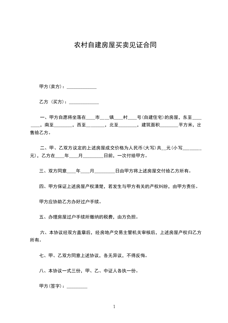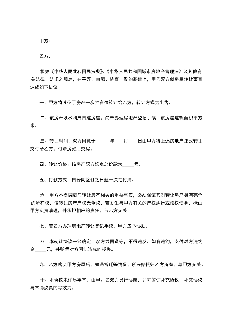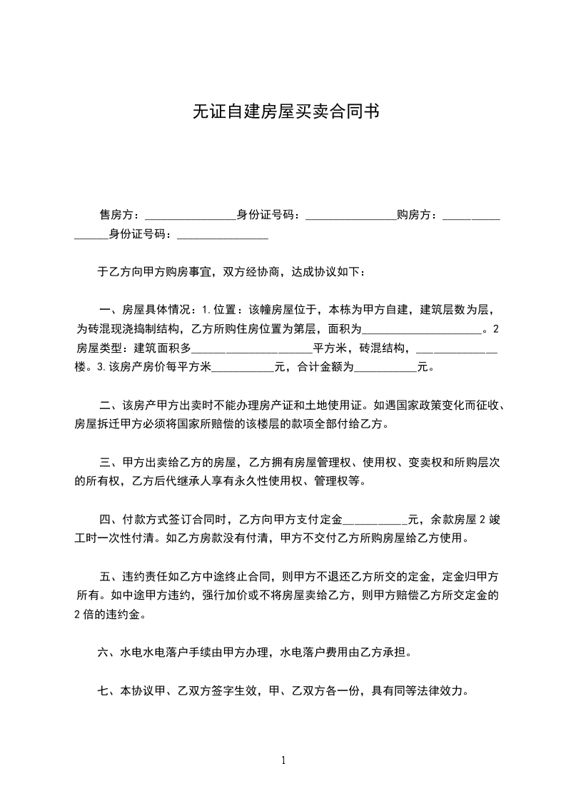 一、房屋具体情况:1.位置:该幢房屋位于,本栋为甲方自建,建筑层数为层,为砖混现浇捣制结构,乙方所购住房位置为第层,面积为_____________________。2.房屋类型:建筑面积多_____________________平方米,砖混结构,______________楼。3.该房产房价每平方米___________元,合计金额为___________元。