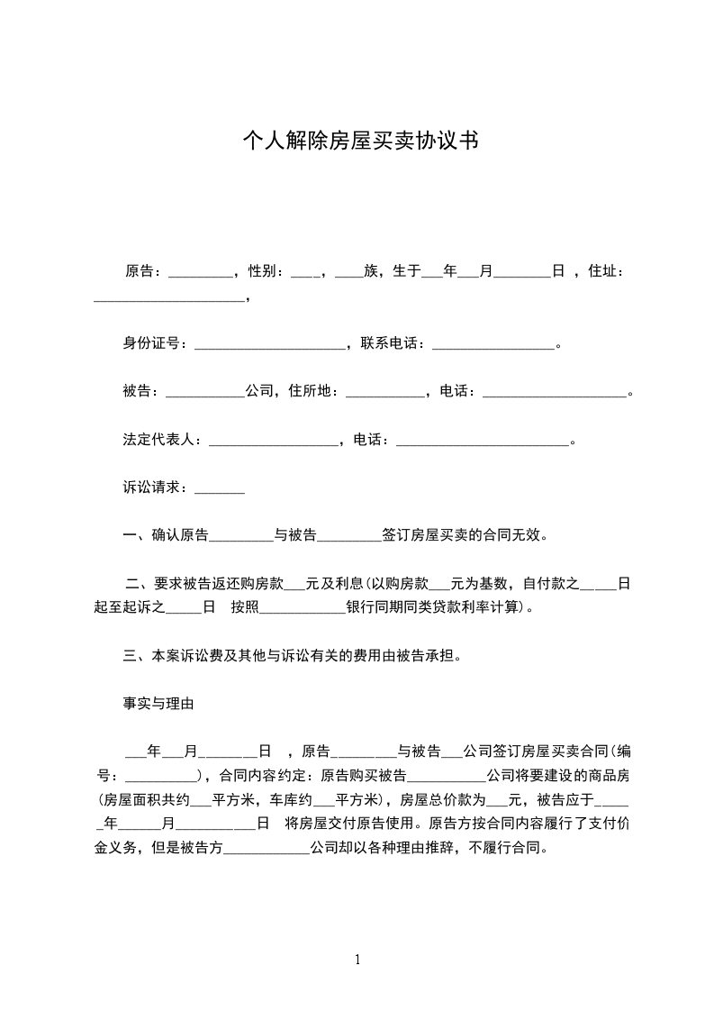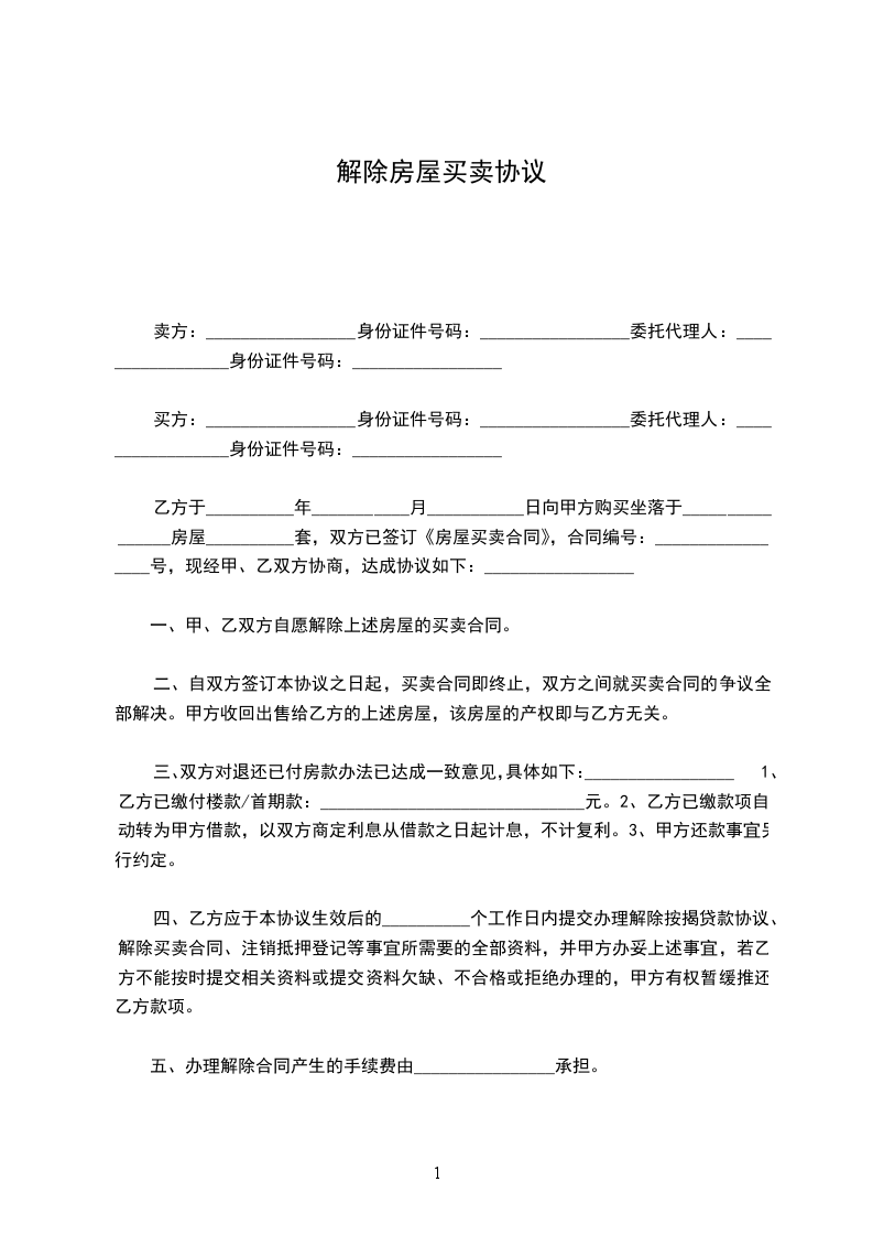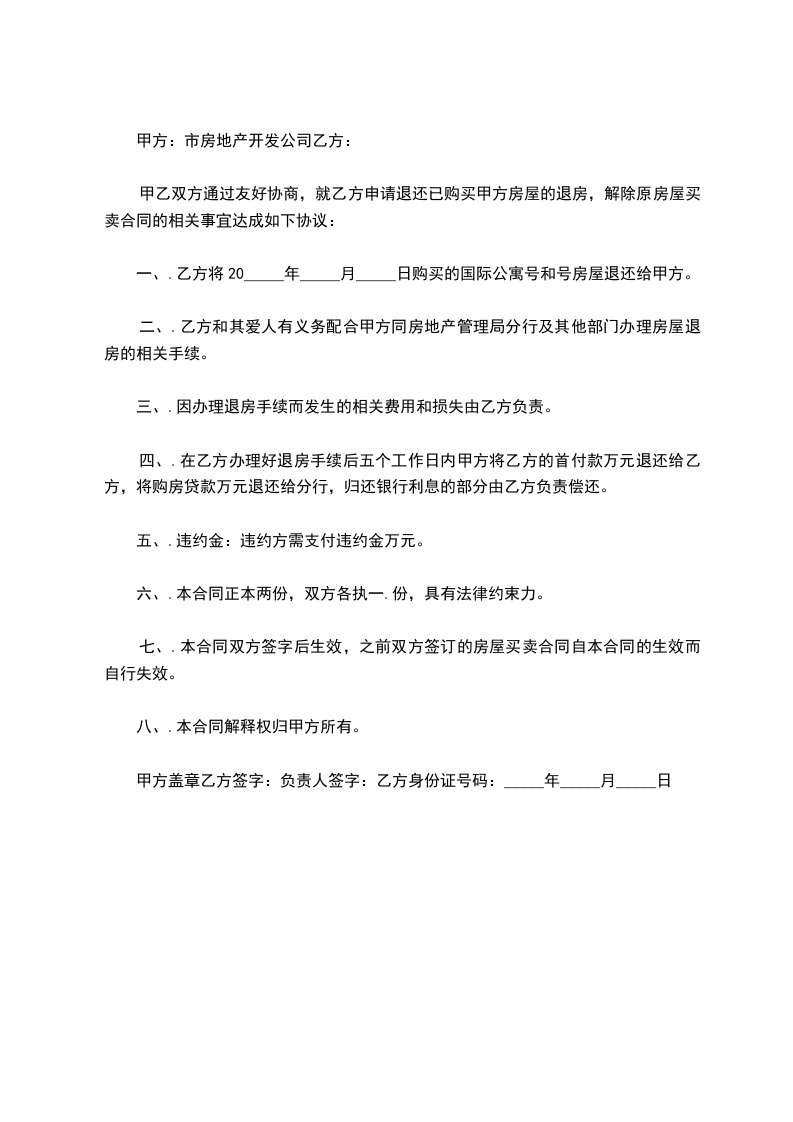 一、.乙方将20_____年_____月_____日购买的国际公寓号和号房屋退还给甲方。
