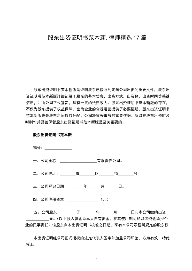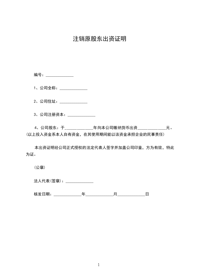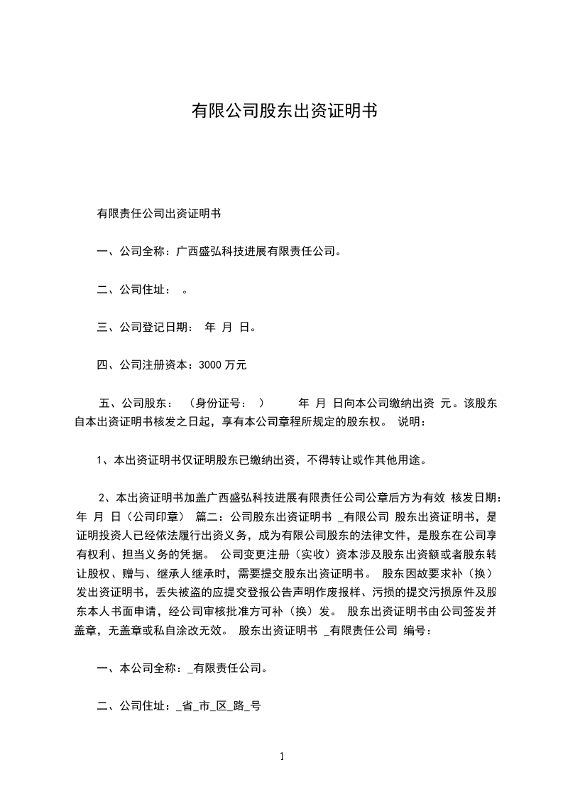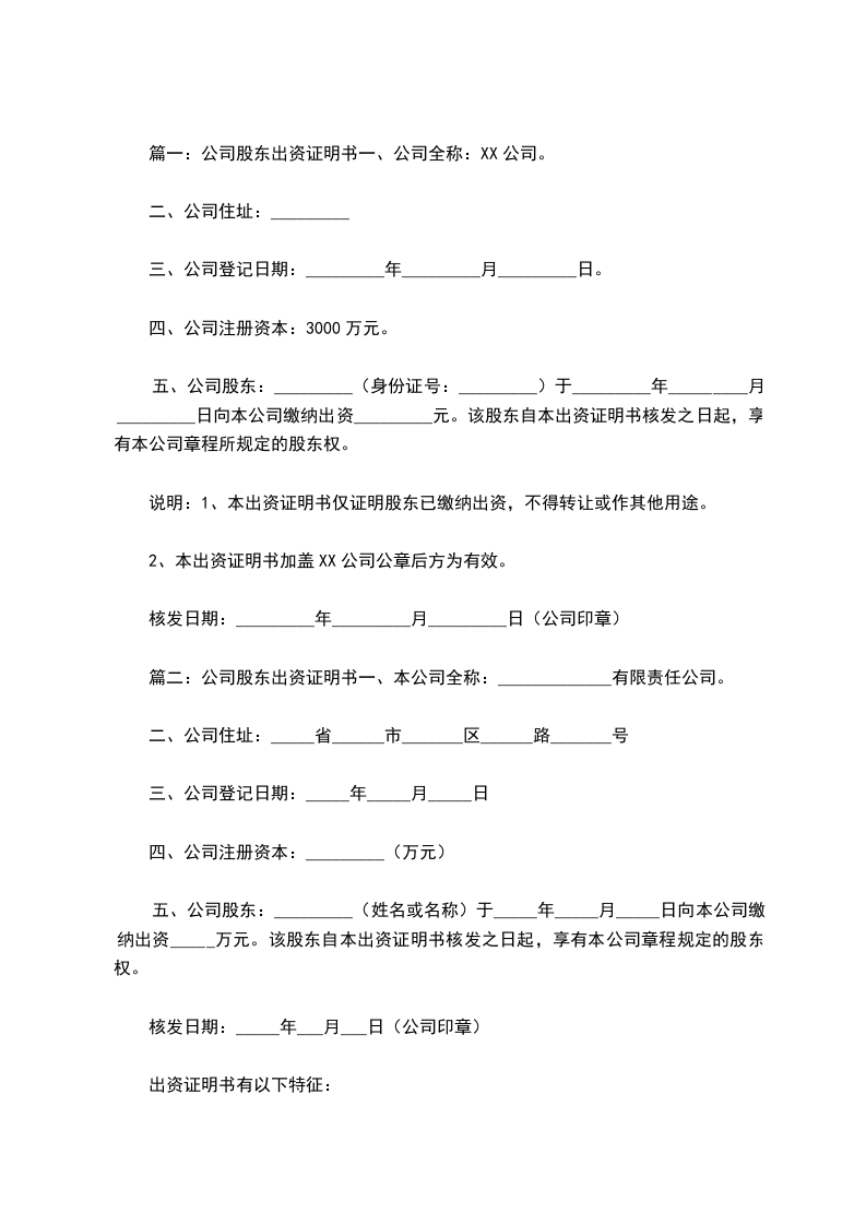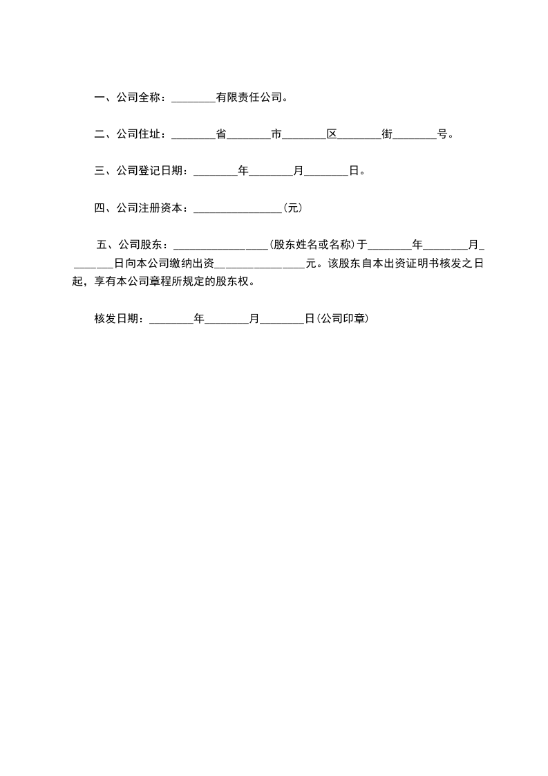 篇二:公司股东出资证明书一、本公司全称:_____________有限责任公司。
