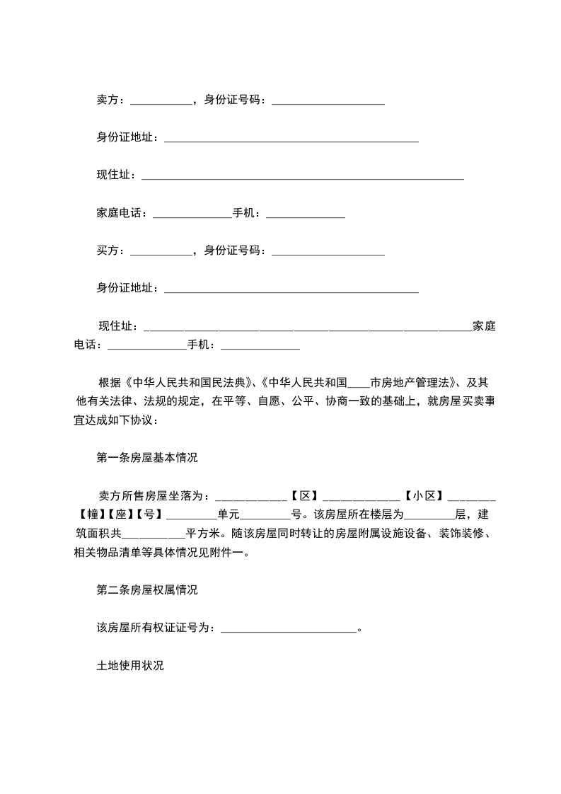 根据《中华人民共和国民法典》、《中华人民共和国____市房地产管理法》、及其他有关法律、法规的规定,在平等、自愿、公平、协商一致的基础上,就房屋买卖事宜达成如下协议:
