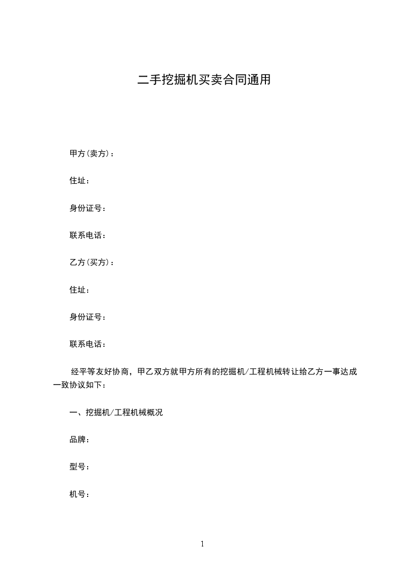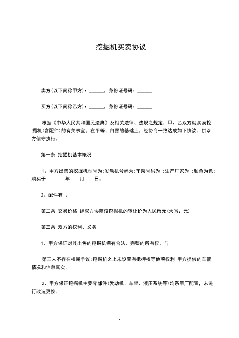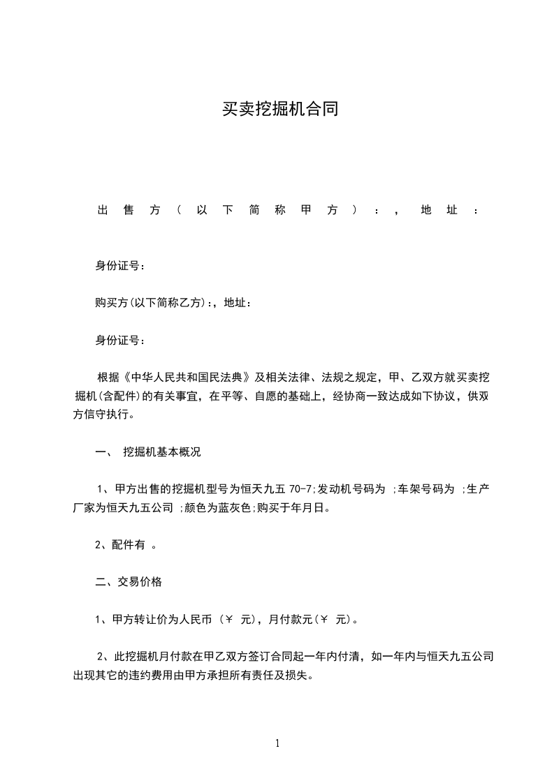 一、甲方同意将自有的旧挖机(该编号为:_______________)出售给乙方,经乙方负责人及技术人员现看机试机后,以协定价格为为人民币为________元,大写________万元整甲方负责惠州到的运输费用。