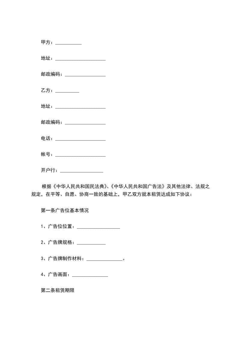 8.1乙方如不能按本合同规定时间租赁,在事先征得甲方同意的前提下,顺延本合同租赁时间如未得到甲方同意,每逾期一日,按______年广告费的1%向甲方支付违约金。