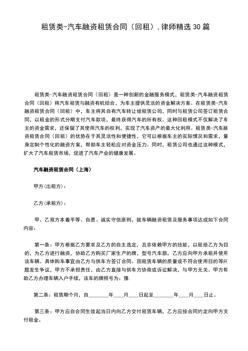 甲方出租方:法定代表人:乙方承租方:甲、乙双方本着平等、自愿、诚实守信原则,就车辆融资租赁及服务事项达成如下合同内容:第一条:甲方依据乙方要求及乙方的自主选定,且非依赖甲方的技能,以租给乙方为目的,为乙方进行融资,协助乙方购买厂家生产的牌,型号汽车部,乙方应向甲方承租并使用该车辆。具体购车事宜由乙方与供车方签订合同。因租赁车辆的质量或不符合使用目的等问题发生争议,甲方不承当责任,由乙方直接与供车方协商或诉讼解决,与甲方无关。甲方帮助乙方办理车辆入户手续,该车的牌照号为:豫.第二条:租赁期个月,自日期起至日期止。