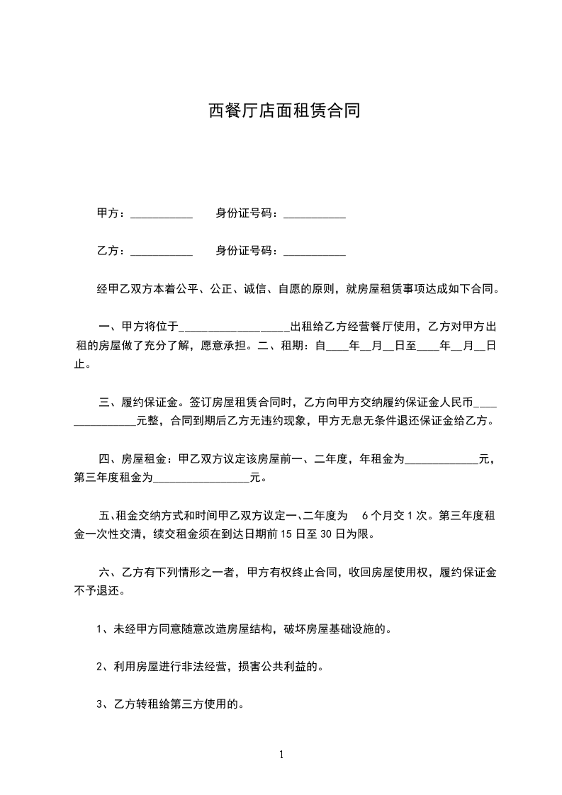 一、甲方将位于___________________出租给乙方经营餐厅使用,乙方对甲方出租的房屋做了充分了解,愿意承担。二、租期:自____年__月__日至____年__月__日止。