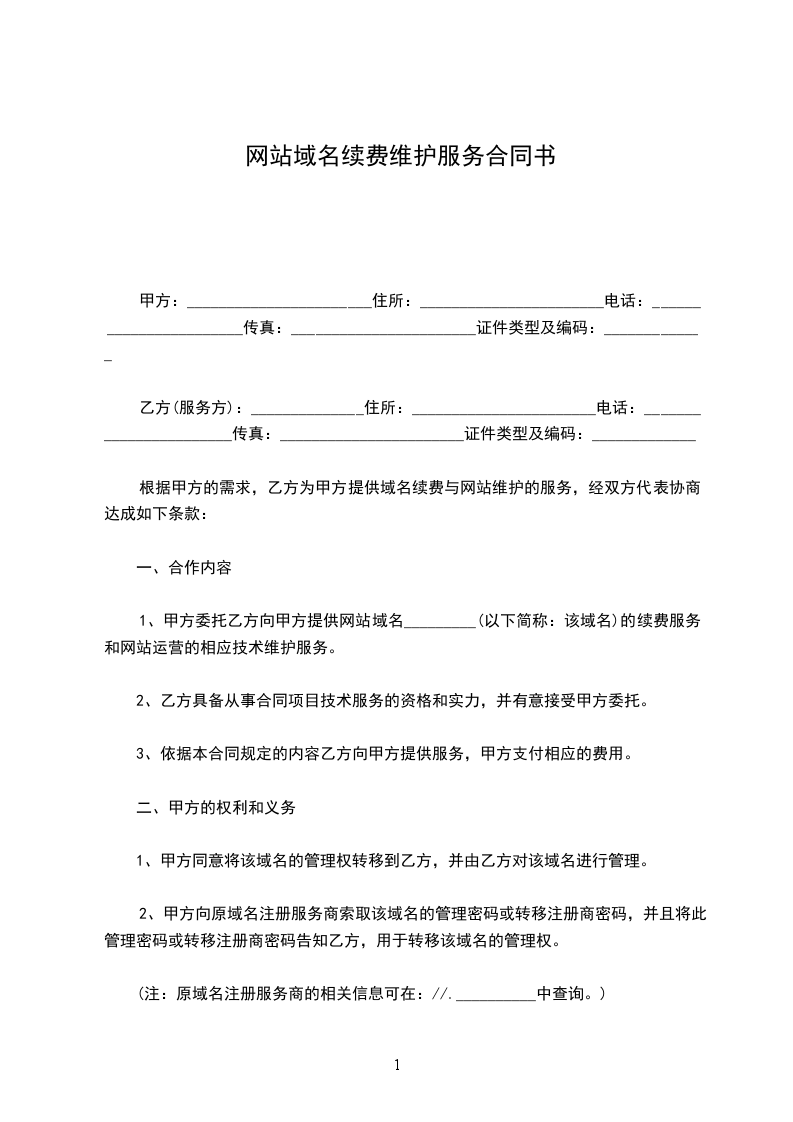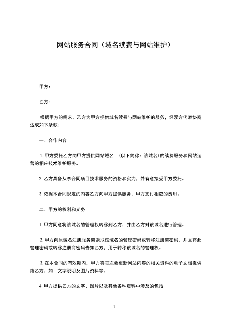 1、甲方委托乙方向甲方提供网站域名_________(以下简称:该域名)的续费服务和网站运营的相应技术维护服务。