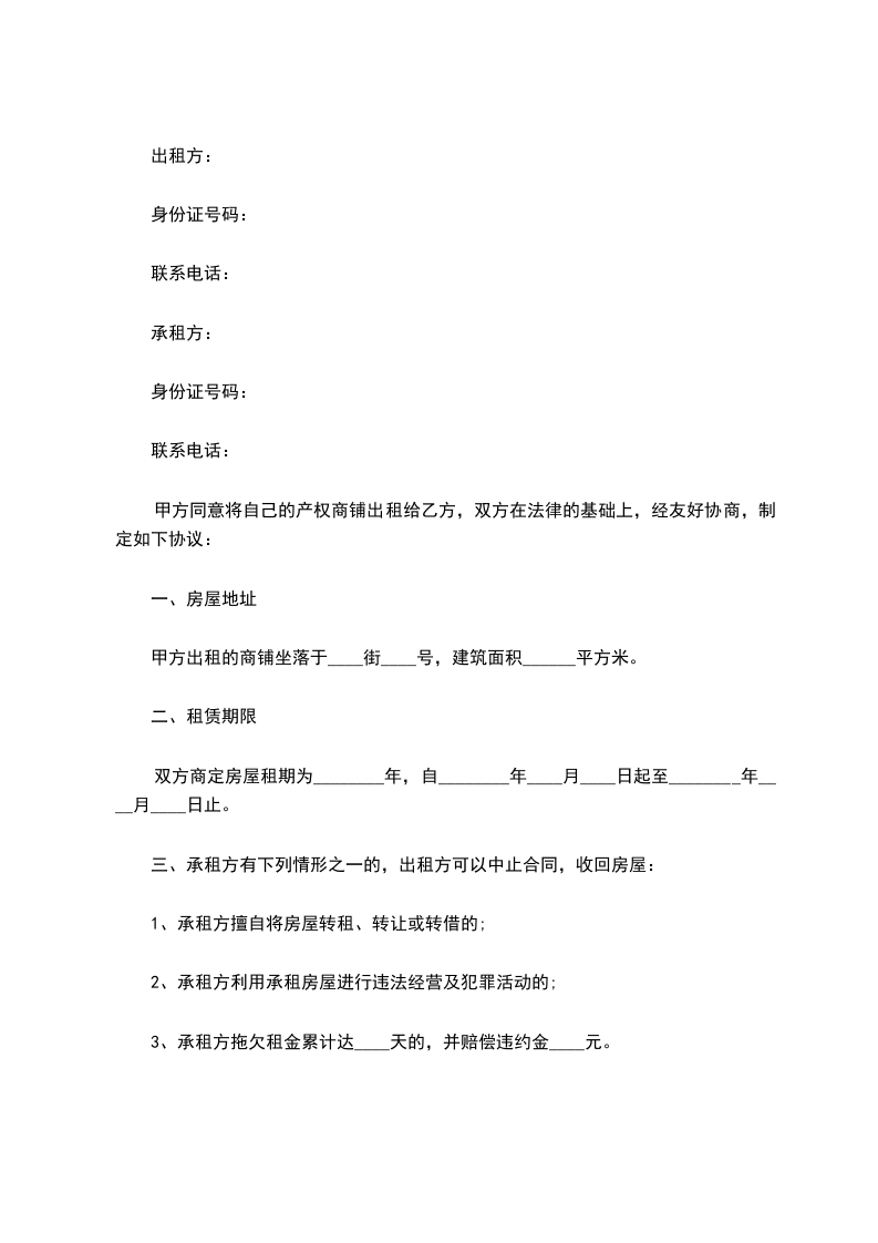 甲方同意将自己的产权商铺出租给乙方,双方在法律的基础上,经友好协商,制定如下协议: