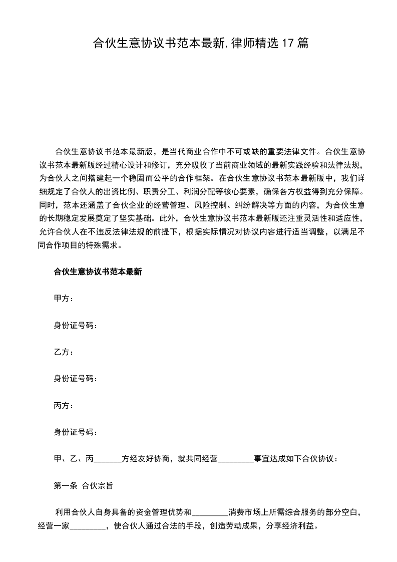 合伙生意协议书范本最新版,是当代商业合作中不可或缺的重要法律文件。合伙生意协议书范本最新版经过精心设计和修订,充分吸收了当前商业领域的最新实践经验和法律法规,为合伙人之间搭建起一个稳固而公平的合作框架。在合伙生意协议书范本最新版中,我们详细规定了合伙人的出资比例、职责分工、利润分配等核心要素,确保各方权益得到充分保障。同时,范本还涵盖了合伙企业的经营管理、风险控制、纠纷解决等方面的内容,为合伙生意的长期稳定发展奠定了坚实基础。此外,合伙生意协议书范本最新版还注重灵活性和适应性,允许合伙人在不违反法律法规的前提下,根据实际情况对协议内容进行适当调整,以满足不同合作项目的特殊需求。