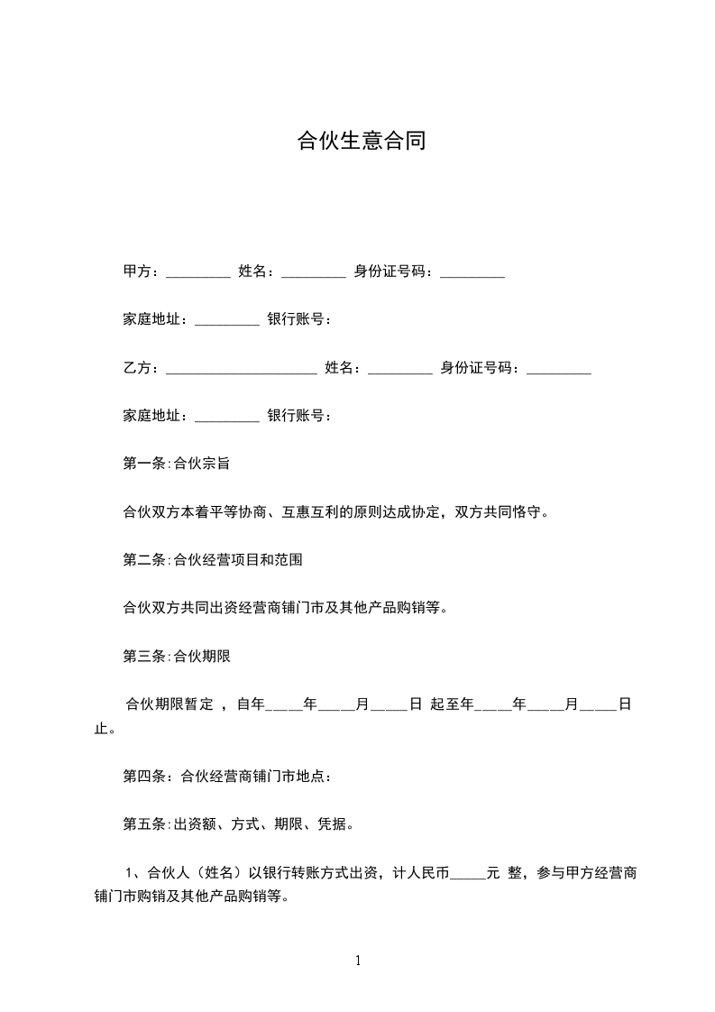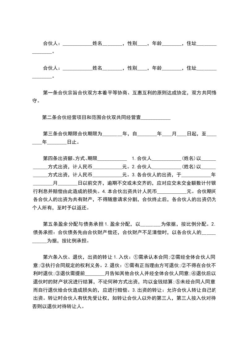 合伙人:____________姓名________,身份证号__________________,持股比例________。合伙人:____________姓名________,身份证号__________________,持股比例________。合伙人:____________姓名________,身份证号__________________,持股比例________。合伙人:____________姓名________,身份证号__________________,持股比例________。第一条、合伙宗旨精诚团结,成人达己。第二条、合伙经营项目和范围二手车租赁、买卖、评估。第三条、合伙期限合伙期限为__五__年,自________年____月____日起,至________年________日止。第四条出资额、方式、期限1.由全体合伙人共筹资100万元用于金昌市范围内的二手车交易的经营。2.各合伙人按约定持股比例承担对应出资额的利息损失,不再单独出资。如持股10%,应对共同出资款的100万其中的10万承担利息。3.本合伙出资共计人民币__100万__元。合伙期间,各合伙人不得随意请求分割。当公司决策各合伙人意见不一致时,合伙人享有对公司决策的绝对决定权。合伙经营期间,各合伙人劳动报酬与公司红利无关,仍按时发放。第五条盈余分配与债务承担1.盈余分配,以_每月每年公司财务报表_为依据,按比例分配。2.债务承担:合伙债务先由合伙财产偿还,合伙财产不足清偿时,以各合伙人的按所持股比例按比例承担。第六条入伙、退伙,出资的转让1.入伙:①需承认本合同;②需经全体合伙人同意;③执行合同规定的权利义务。2.退伙:①需有正当理由方可退伙;②不得在合伙不利时退伙;③退伙需提前________月告知其他合伙人并经全体合伙人同意;④退伙后以退伙时的财产状况进行结算,不论何种方式出资,均以金钱结算;⑤未经合同人同意而自行退伙给合伙造成损失的,应进行赔偿。3.出资的转让:在合伙经营期间,任一合伙人不得擅自转让自己的股份,否则视为退伙,并不予补偿。第七条合伙负责人及其他合伙人的权利1.____________为合伙负责人。其权限是:①对外开展业务,订立合同;②对合伙事业进行日常管理;③购买和出售二手车;④支付合伙债务;⑤其他事宜。2.其他合伙人的权利:①参予合伙事业的管理;②听取合伙负责人开展业务情况的报告;④共同决定合伙重大事项。3、合伙人_________________的职责:4、合伙人_________________的职责:5、合伙人_________________的职责:6、合伙人_________________的职责:第八条禁止行为1.未经全体合伙人同意,禁止任何合伙人私自以合伙名义进行业务活动;如其业务获得利益归合伙,造成损失按实际损失赔偿。2.禁止合伙人经营与合伙竞争的业务。3.禁止合伙人再加入其他合伙。4.禁止合伙人与本合伙签订合同。5.如合伙人违反上述各条,应按合伙实际损失赔偿。劝阻不听者可由全体合伙人决定除名。第九条合伙的终止及终止后的事项1.合伙因以下事由之一得终止:①合伙期届满;②全体合伙人同意终止合伙关系;③合伙事业完成或不能完成;④合伙事业违反法律被撤销;⑤法院根据有关当事人请求判决解散。2.合伙终止后的事项:①即行推举清算人,并邀请____________中间人(或公证员)参与清算;②清算后如有盈余,则按收取债权、清偿债务、返还出资、按比例分配剩余财产的顺序进行。固定资产和不可分物,可作价卖给合伙人或第三人,其价款参与分配;③清算后如有亏损,不论合伙人出资多少,先以合伙共同财产偿还,合伙财产不足清偿的部分,由合伙人按出资比例承担。第十条纠纷的解决合伙人之间如发生纠纷,应共同协商,本着有利于合伙事业发展的原则予以解决。如协商不成,可以诉诸法院。第十一条本合同自订立并报经工商行政管理机关批准之日起生效并开始营业。第十二条本合同如有未尽事宜,应由合伙人集体讨论补充或修改。补充和修改的内容与本合同具有同等效力。第十三条其他第十四条本合同正本一式____份,合伙人各执一份,送____各存一份。合伙人:____________合伙人:________________年____月____日