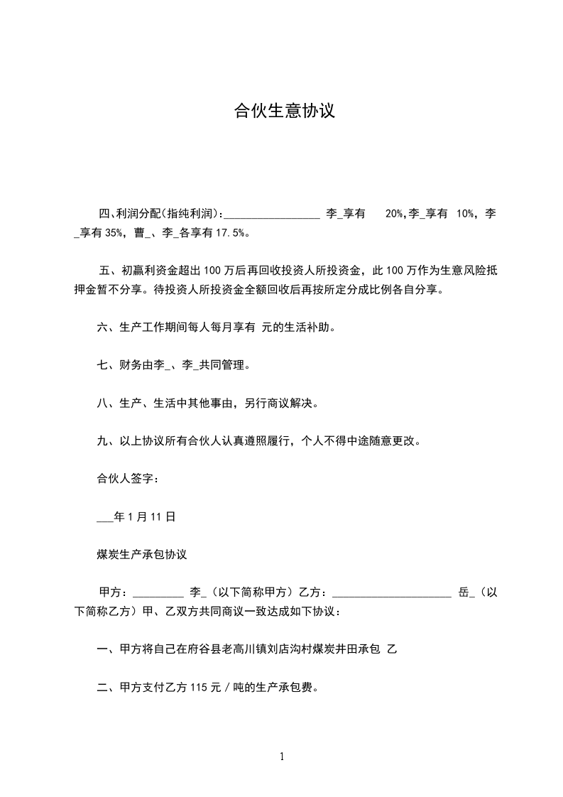 合伙生意协议书范本