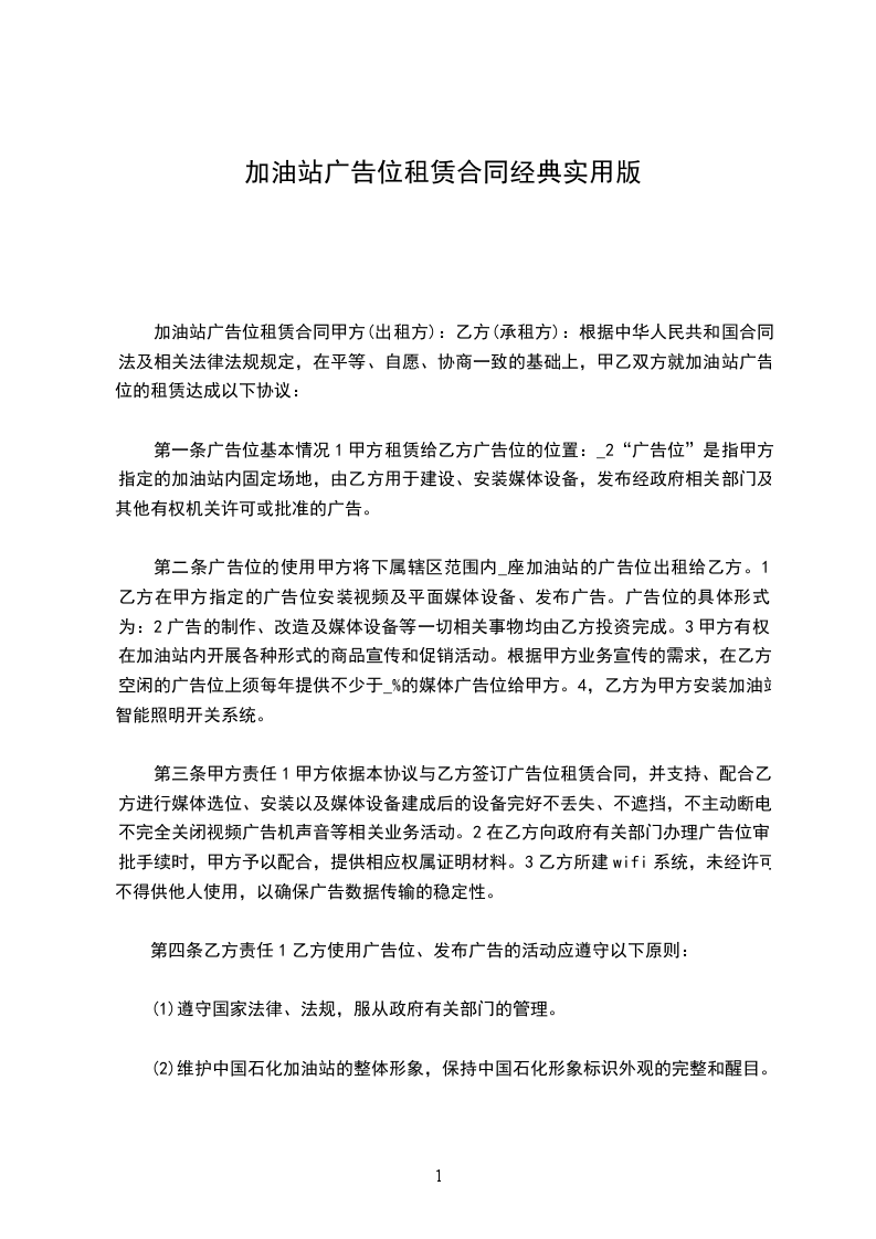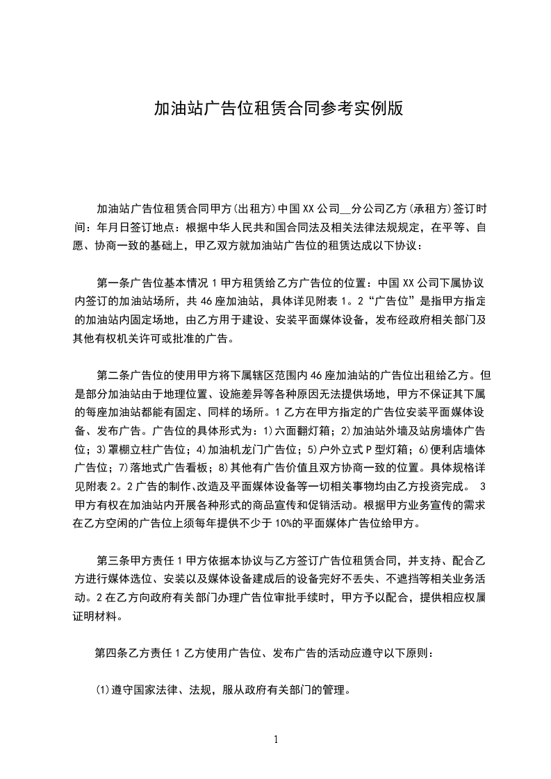 根据《中华人民共和国民法典》及相关法律法规规定,在平等、自愿、协商一致的基础上,甲乙双方就加油站广告位的租赁达成以下协议: