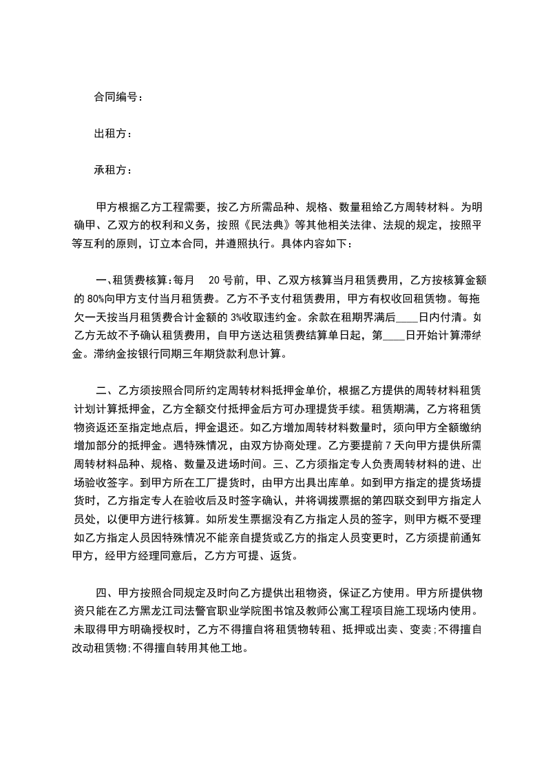 甲方根据乙方工程需要,按乙方所需品种、规格、数量租给乙方周转材料。为明确甲、乙双方的权利和义务,按照《民法典》等其他相关法律、法规的规定,按照平等互利的原则,订立本合同,并遵照执行。具体内容如下:
