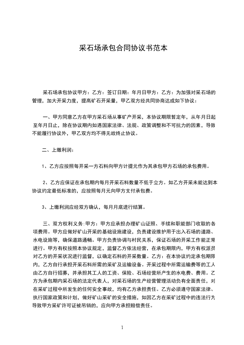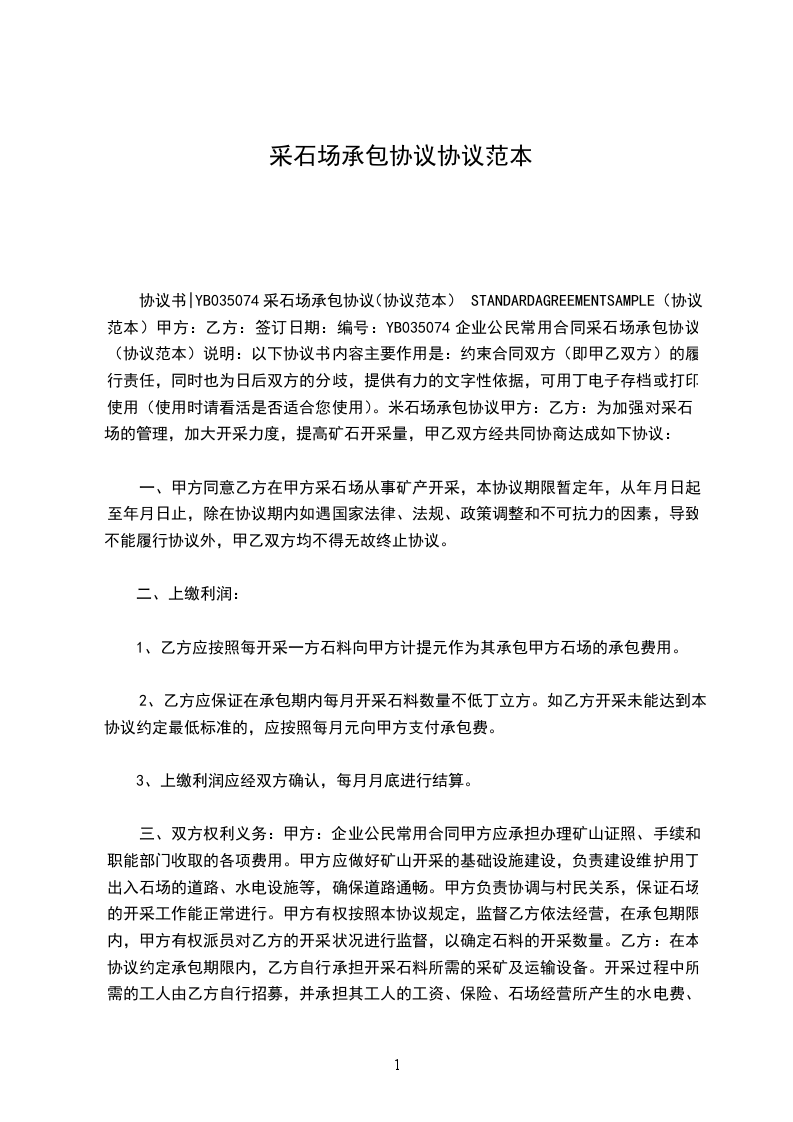 协议书|YB035074采石场承包协议(协议范本)STANDARDAGREEMENTSAMPLE(协议范本)甲方:乙方:签订日期:编号:YB035074企业公民常用合同采石场承包协议(协议范本)说明:以下协议书内容主要作用是:约束合同双方(即甲乙双方)的履行责任,同时也为日后双方的分歧,提供有力的文字性依据,可用丁电子存档或打印使用(使用时请看活是否适合您使用)。米石场承包协议甲方:乙方:为加强对采石场的管理,加大开采力度,提高矿石开采量,甲乙双方经共同协商达成如下协议: