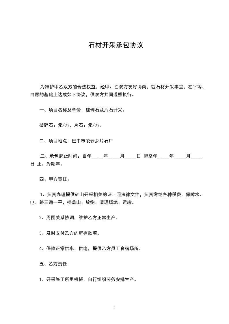 一、 甲方将自己所有的座落在 亩发包给乙方从事采石经营,地块南北长 米,东西长 米。四至:北至,东至 ,南至
