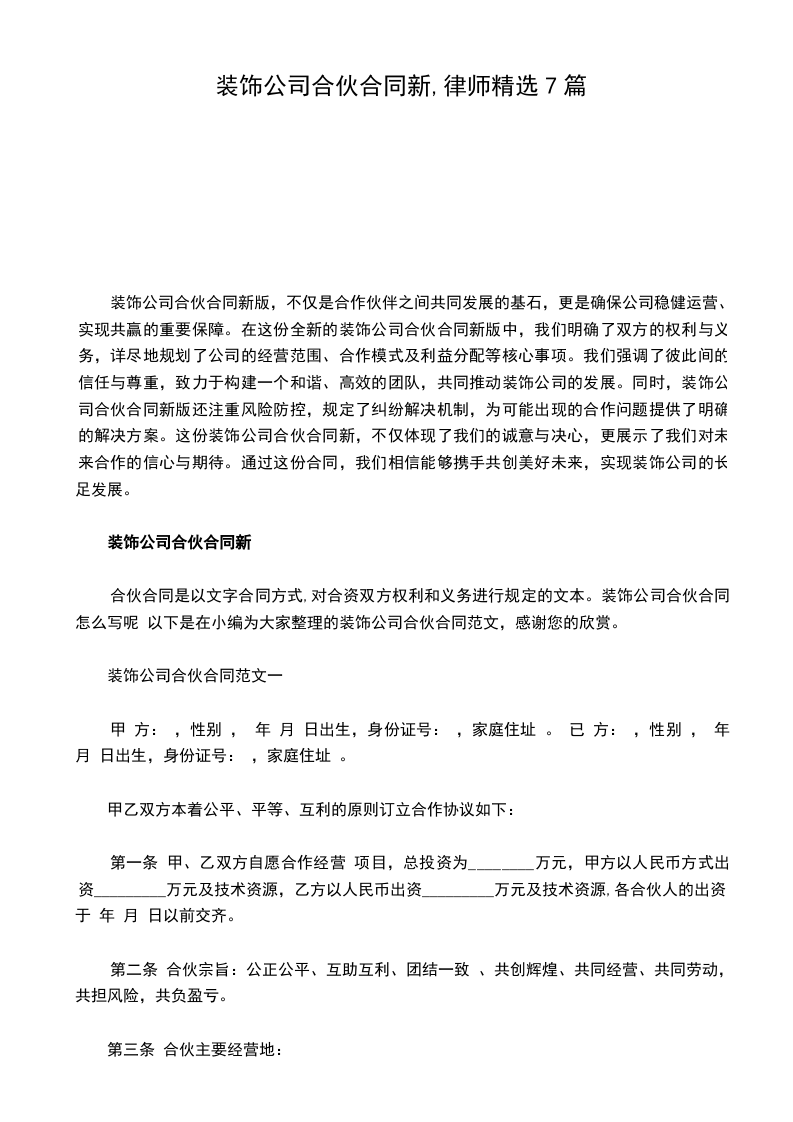 装饰公司合伙合同新版,不仅是合作伙伴之间共同发展的基石,更是确保公司稳健运营、实现共赢的重要保障。在这份全新的装饰公司合伙合同新版中,我们明确了双方的权利与义务,详尽地规划了公司的经营范围、合作模式及利益分配等核心事项。我们强调了彼此间的信任与尊重,致力于构建一个和谐、高效的团队,共同推动装饰公司的发展。同时,装饰公司合伙合同新版还注重风险防控,规定了纠纷解决机制,为可能出现的合作问题提供了明确的解决方案。这份装饰公司合伙合同新,不仅体现了我们的诚意与决心,更展示了我们对未来合作的信心与期待。通过这份合同,我们相信能够携手共创美好未来,实现装饰公司的长足发展。