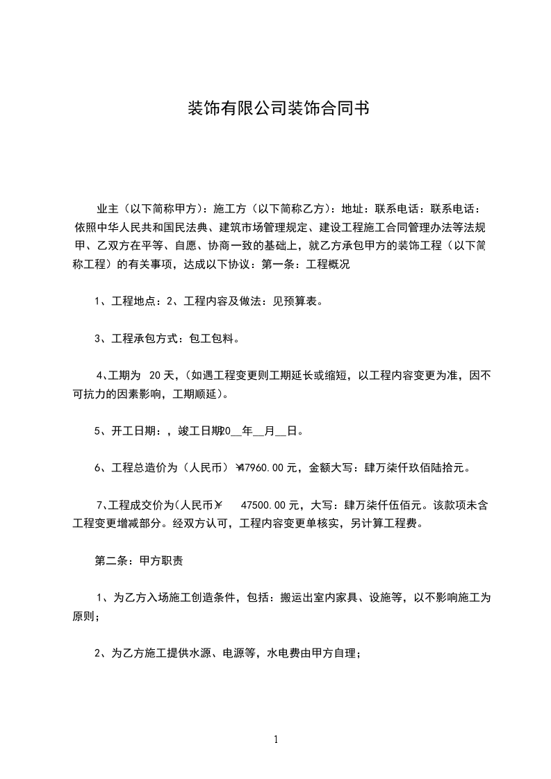 第一条甲乙双方自愿合作经营南充巴洛克装饰工程有限公司,总投资为_______万元,甲方以人民币方式出资____万元,占出资比例乙方以人民币出资_____万元,占出资比例。