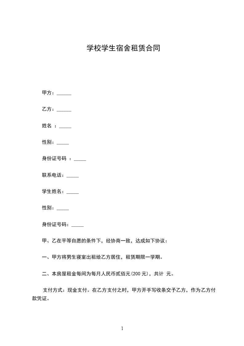 一、甲方将男生寝室出租给乙方居住,租赁期限一学期。