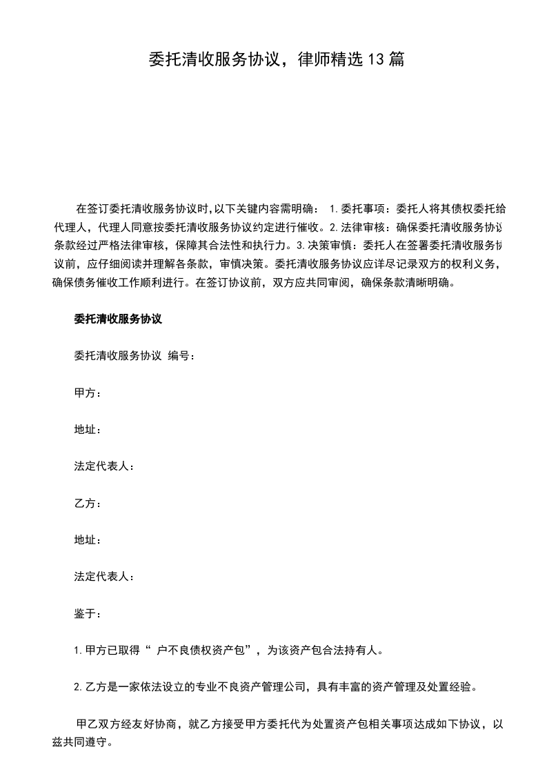 在签订委托清收服务协议时,以下关键内容需明确:1.委托事项:委托人将其债权委托给代理人,代理人同意按委托清收服务协议约定进行催收。2.法律审核:确保委托清收服务协议条款经过严格法律审核,保障其合法性和执行力。3.决策审慎:委托人在签署委托清收服务协议前,应仔细阅读并理解各条款,审慎决策。委托清收服务协议应详尽记录双方的权利义务,确保债务催收工作顺利进行。在签订协议前,双方应共同审阅,确保条款清晰明确。